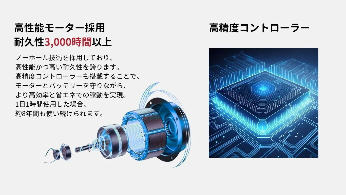 ■小型なのにパワフル!楽しいライディングを味わおう! ノーホール技術のモーターを搭載しており、高性能かつ高い耐久性を誇ります。 1日1時間使用した場合、約8年間も使い続けられます。