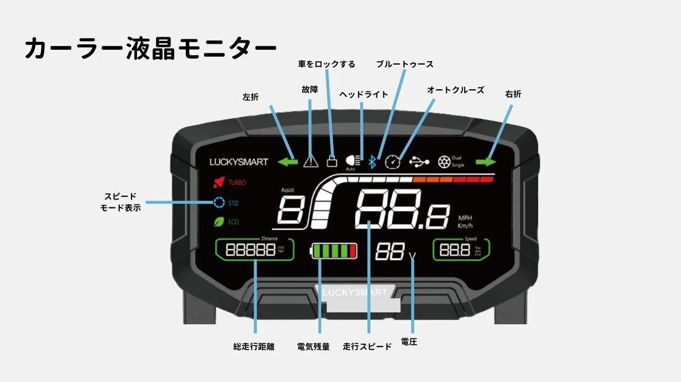 ■分かりやすいカラー液晶モニター デザイン性を兼ね備えたデジタルモニターを装備。電池残量と走行速度を分かり易く、一目瞭然で確認が可能。またワンタッチで、走行モードを簡単に切り替えることが出来ます。