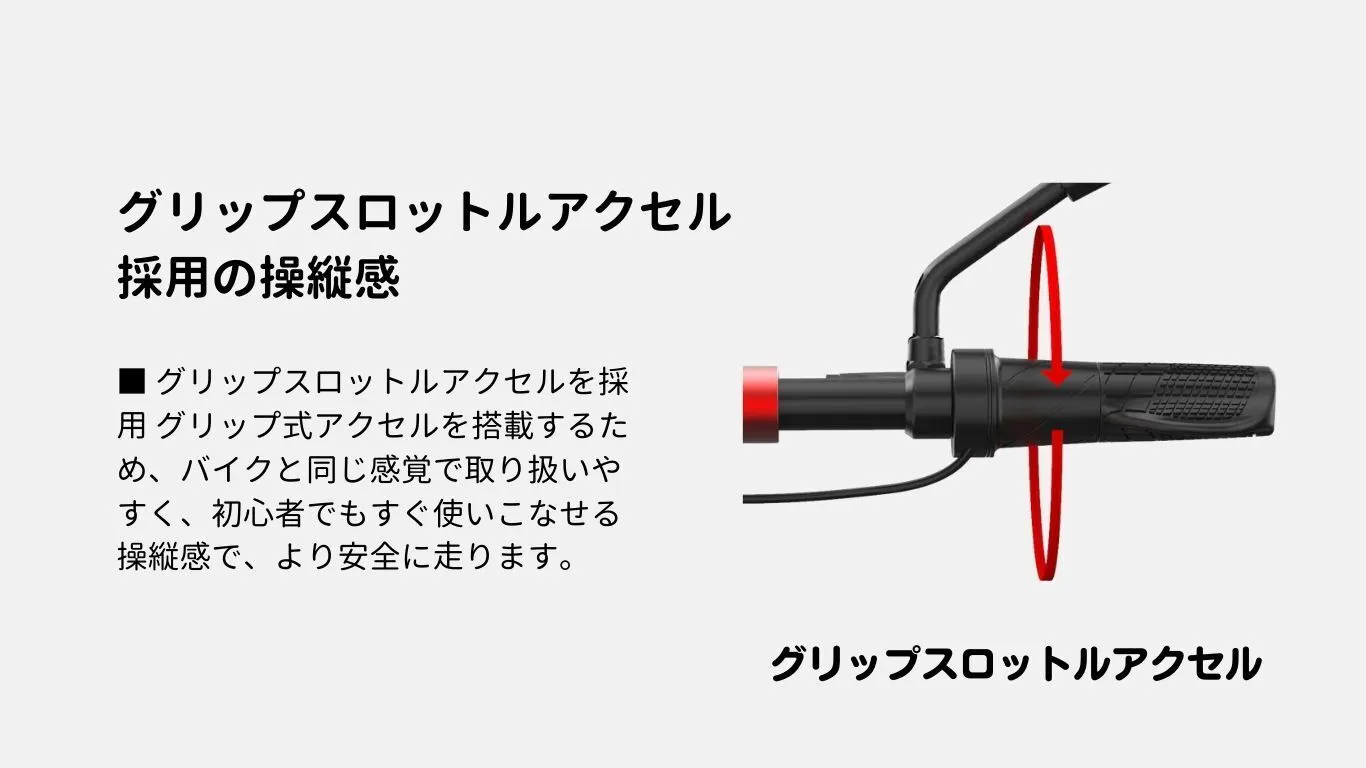 ■グリップスロットルアクセルを採用 グリップスロットルアクセルを搭載し、バイクと同じ感覚で取り扱いやすく、初心者でもすぐ使いこなせる。直感的な操縦性で、指アクセルタイプより、指の疲れも解消出来ます。