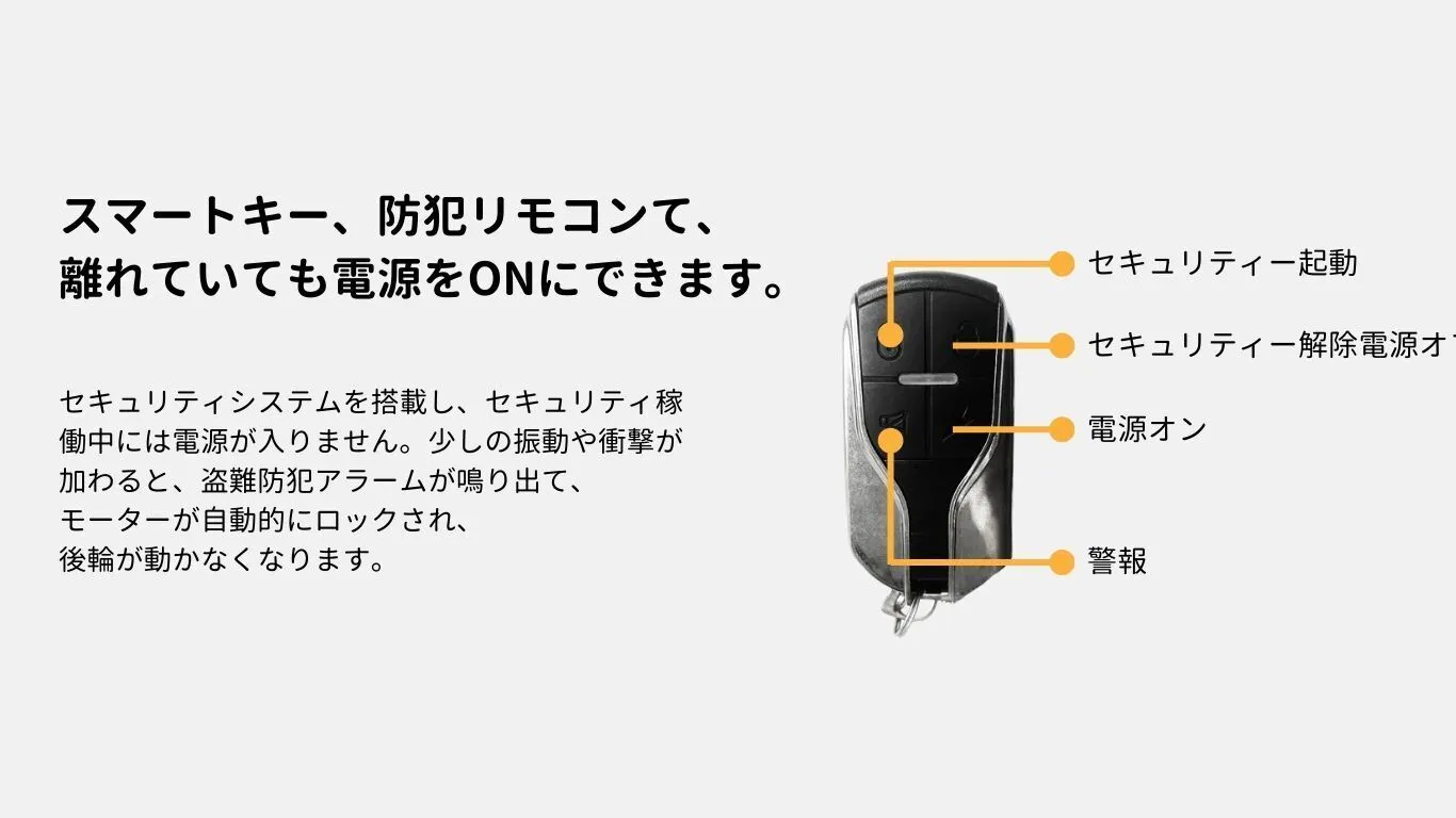 ■防犯リモコン付きスマートキー 離れていても電源をONにできます。セキュリティシステムを搭載し、セキュリティ稼働中には電源が入りません。少しの振動や衝撃が加わると、盗難防犯アラームが鳴り出して、モーターが自動的にロックされ、後輪が動かなくなります。