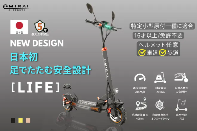 私たちイープラスミライは、日本の電動モビリティメーカーとして、日本製ならではの優れた品質と信頼性を誇る製品を提供することに力を注ぐと共に、手頃な価格で商品を手にして頂くために、広告費を削減し、お客様に還元していきます。生活向上のため、より快適にまた身近な移動手段として、是非この機会にイープラスミライの最新製品【Life】をお試しください。私達が開発した商品は日本道路交通法に適応した最新モデルとなっており、特別カラーとフル装備グレードです。 CAMPFIRE 限定の特別割引となっている為、是非この機会に【Life】をご体験ください。