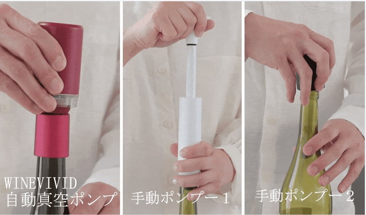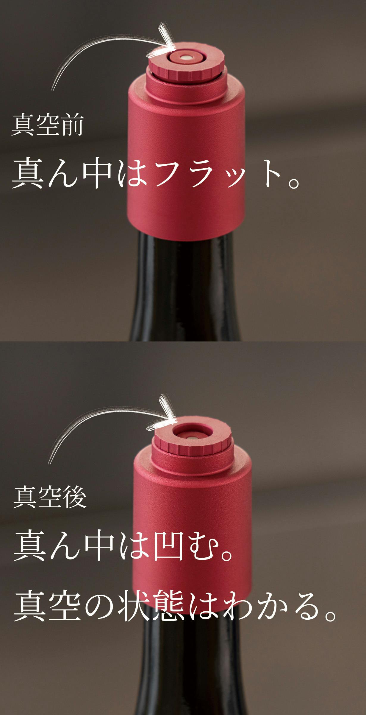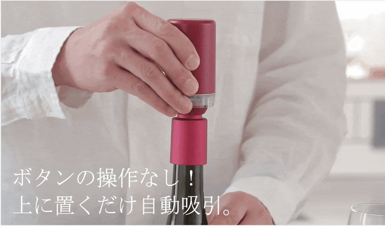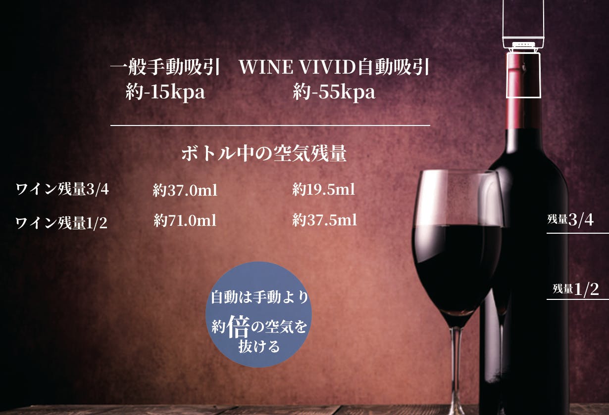 従来のような手動ではなく、自動吸引ポンプでボトル内を真空化!ワインの酸化を軽減することで、次の日もおいしく飲むことができます。