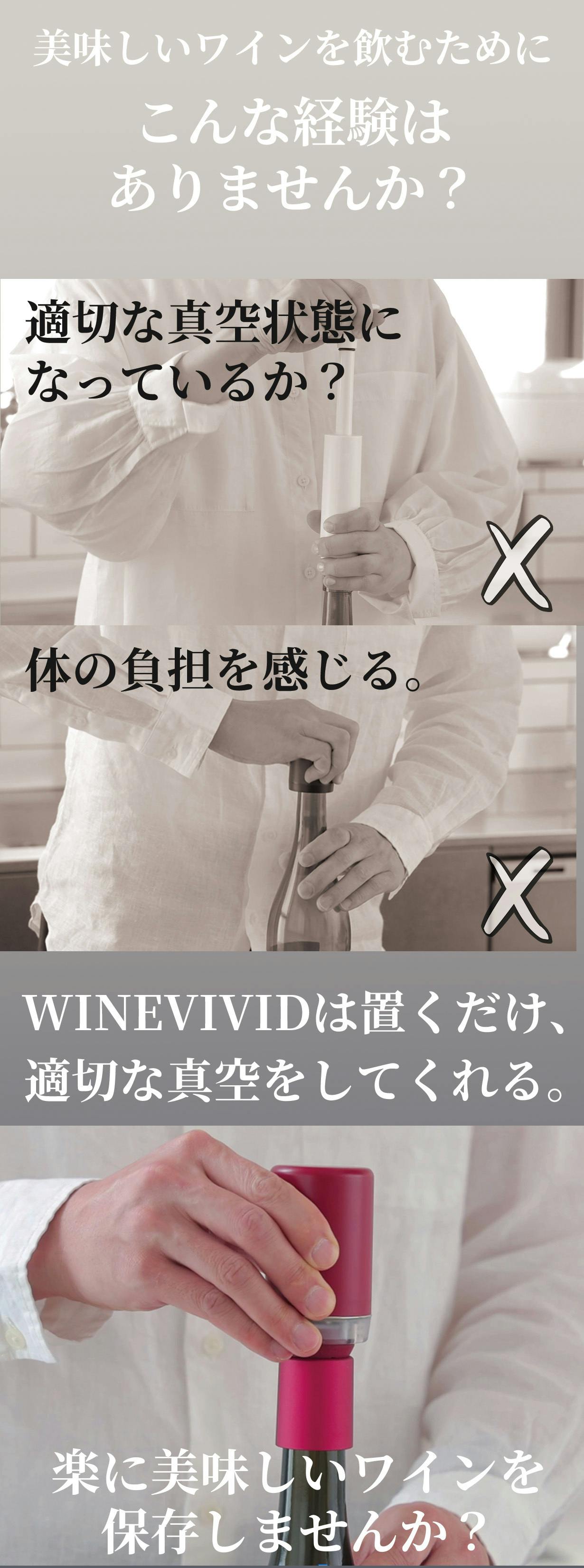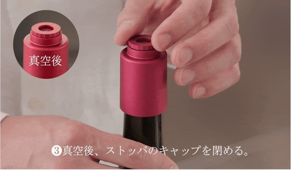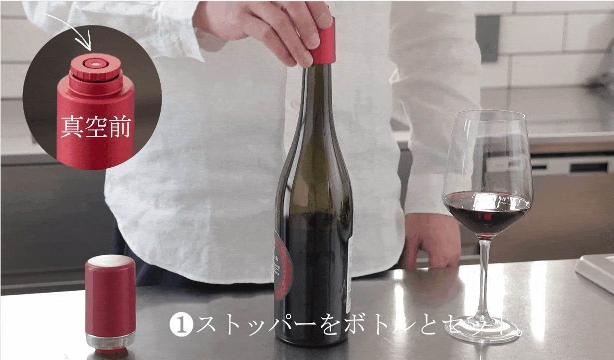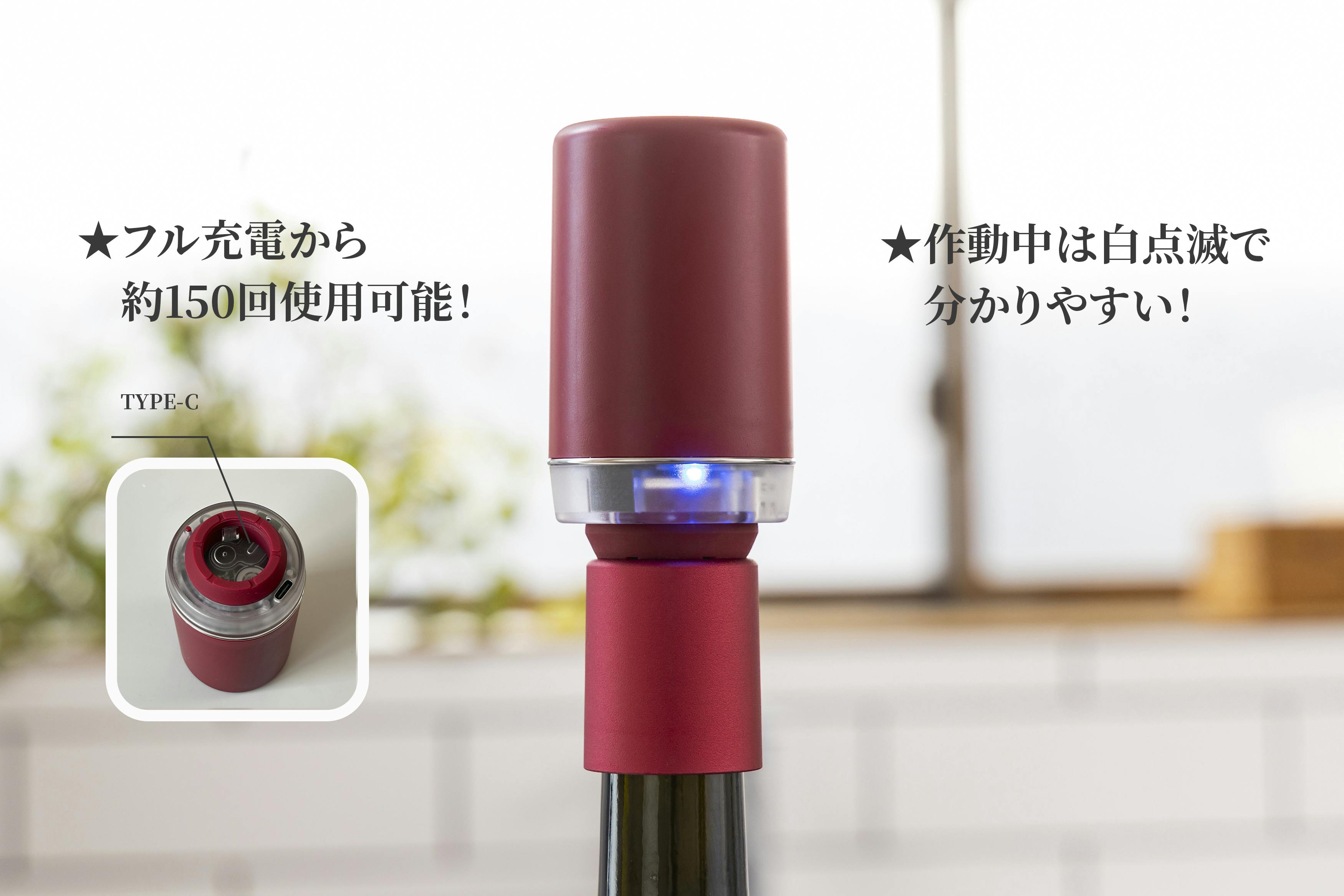 従来のような手動ではなく、自動吸引ポンプでボトル内を真空化!ワインの酸化を軽減することで、次の日もおいしく飲むことができます。