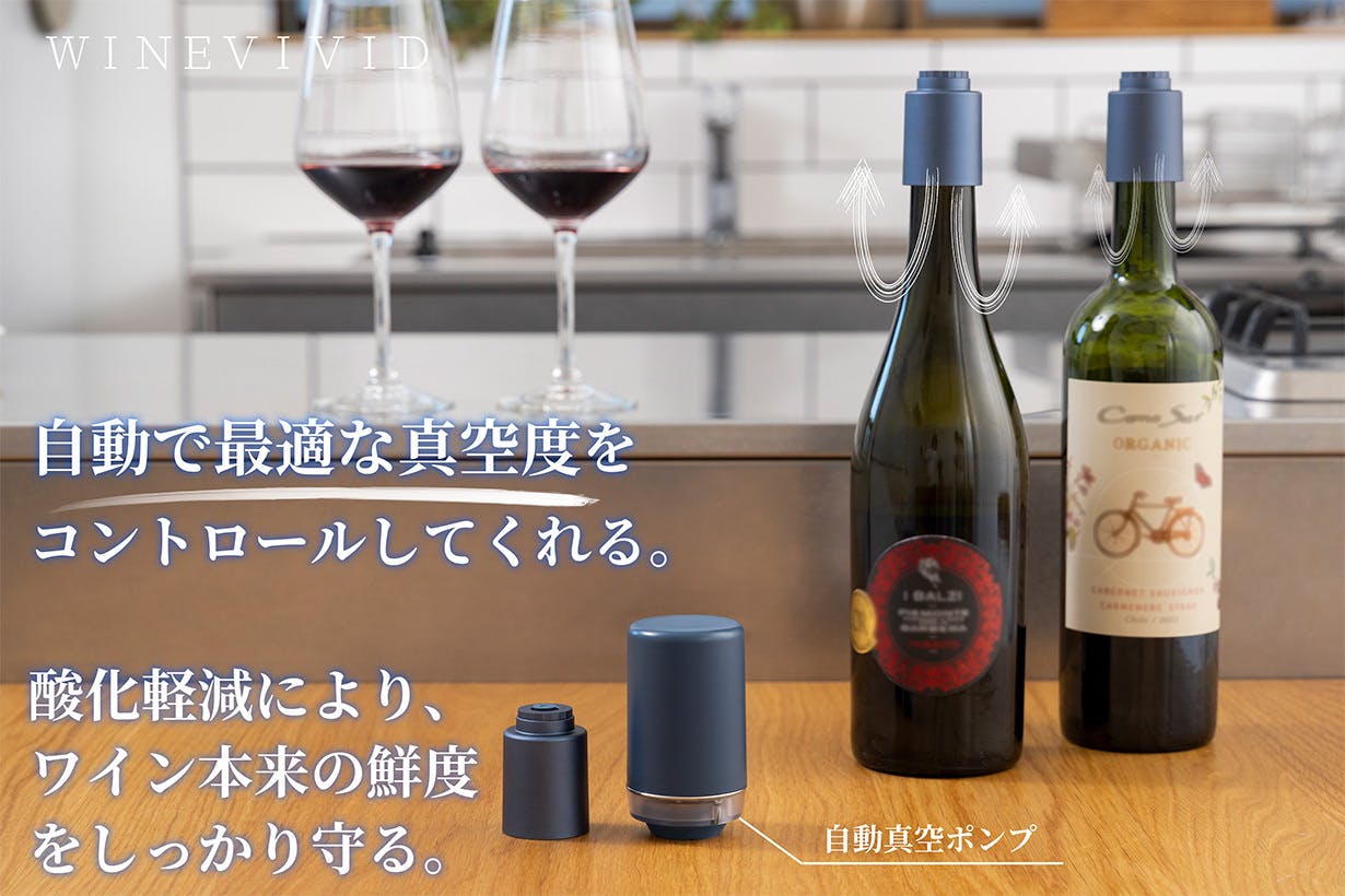 飲み残しのワインが美味しくなくなってしまった、という主な原因は、ワインが空気に触れて酸化が進んでしまうこと。保存したいと思ったら、空気をなくなるべくボトルから少なくするのがイチバンです。WINEVIVIDはボトル内から空気を抜き、酸化から守ることで美味しい状態を⻑続きさせてくれます。