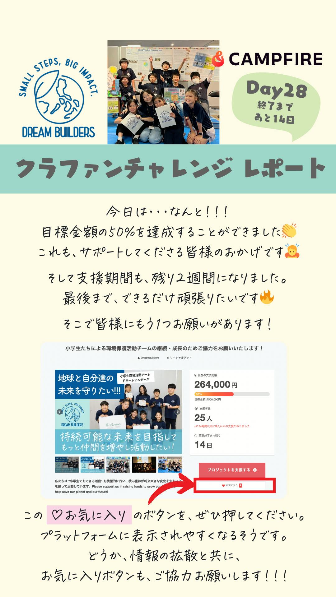 今日は・・・なんと!!!目標金額の50%を達成することができました!これも、サポートしてくださる皆様のおかげです。そして支援期間も、残り2週間になりました。最後まで、できるだけ頑張りたいです!!! そこで皆様にもう1つお願いがあります!この ❤お気に入り のボタンを、ぜひ押してください。プラットフォームに表示されやすくなるそうです。どうか、情報の拡散と共に、お気に入りボタンも、ご協力お願いします!!!