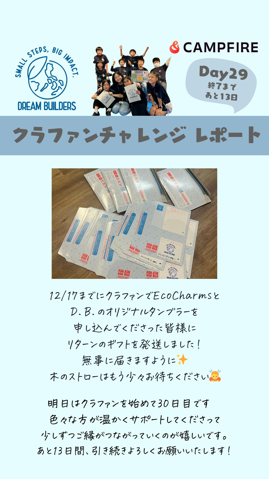 12/17までにクラファンでEcoCharmsとD.B.のオリジナルタンブラーを申し込んでくださった皆様にリターンのギフトを発送しました!無事に届きますように☆木のストローはもう少々お待ちください。明日はクラファンを始めて30日目です!色々な方が温かくサポートしてくださって少しずつご縁がつながっていくのが嬉しいです。残りの13日間、一人でも多くの方に活動を知っていただけたらと思っています。引き続き、情報の拡散など、ご協力をお願いいたします!