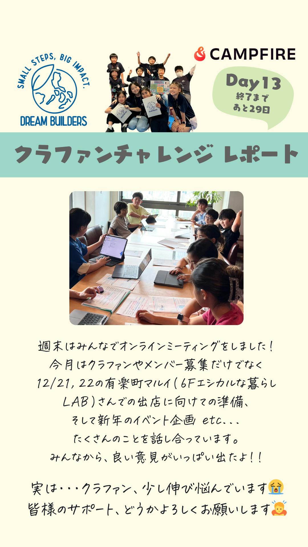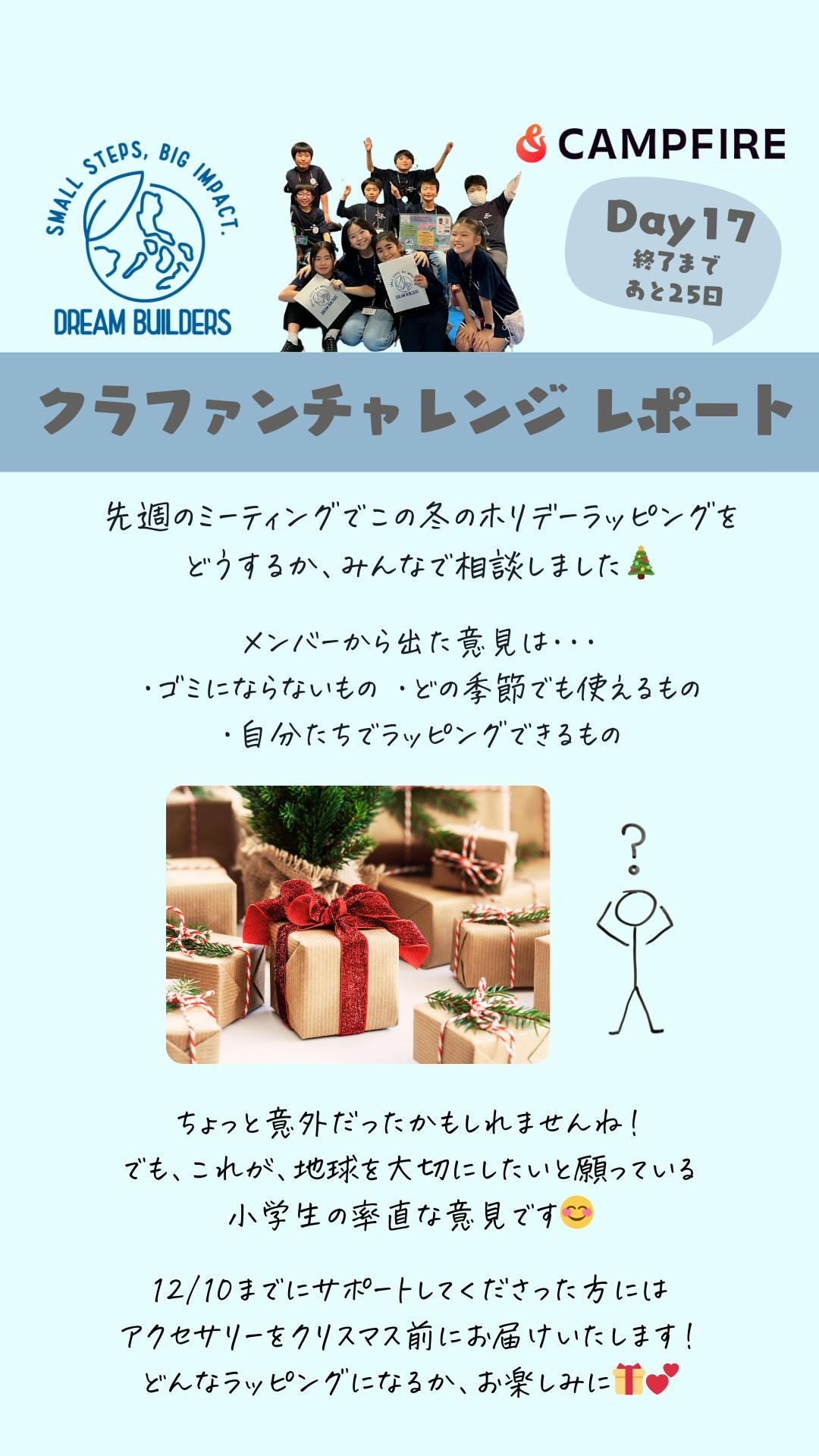 こんばんは!ドリームビルダーズです。先週のミーティングでのみんなとの話し合いでのことをご紹介します(^^)この冬、ドリームビルダーズでは、クラファンだけでなく、有楽町マルイさんでの販売会も予定しています。その時のホリデーラッピングをどうするか、みんなで相談しました。メンバーから出た意見は・・・・ゴミにならないもの ・どの季節でも使えるもの・自分たちでラッピングできるものいかがですか?子どもはキラキラしたものが好き、派手なラッピングのものが好き、と思っていませんでしたか?もしそうだとしたら、意外だったかもしれませんね!でも、これが、地球を大切にしたいと願っている小学生の率直な意見です♪12/10までにサポートしてくださった方には、アクセサリーをクリスマス前にお届けいたします。どんなラッピングになるか、お楽しみにしていてくださいね!