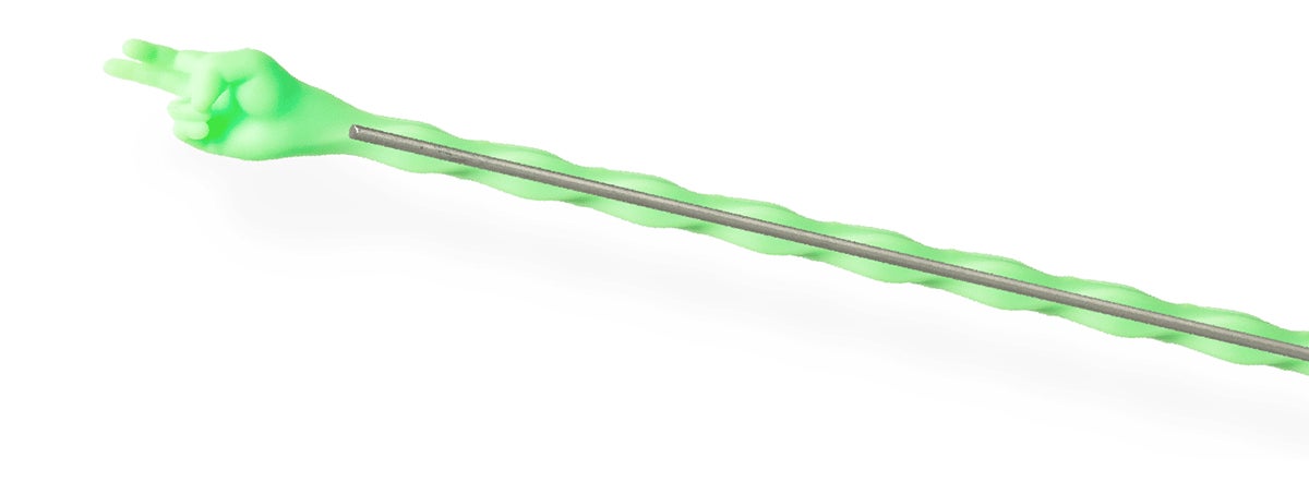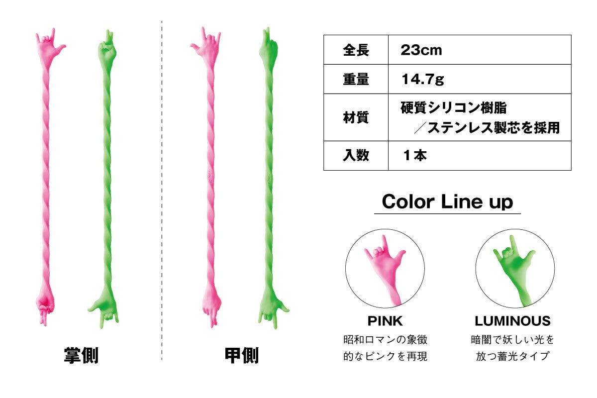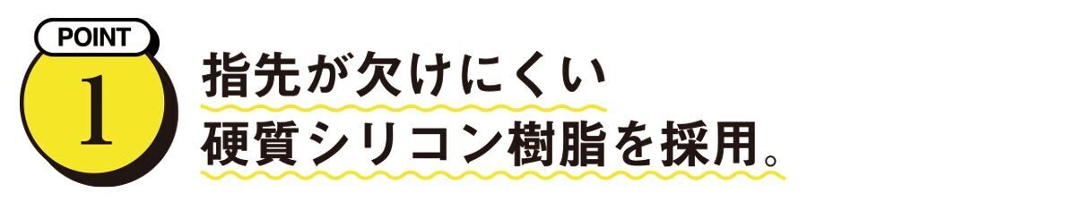 通常の樹脂製では硬すぎると指が折れてしまい、柔らかいとステアしにくい。形状維持能力の高さから指先が欠けにくく衛生面と成型のしやすさ、カラーバリエーションの柔軟さ、耐薬品性などマドラーにふさわしい硬質シリコン樹脂製としました。
