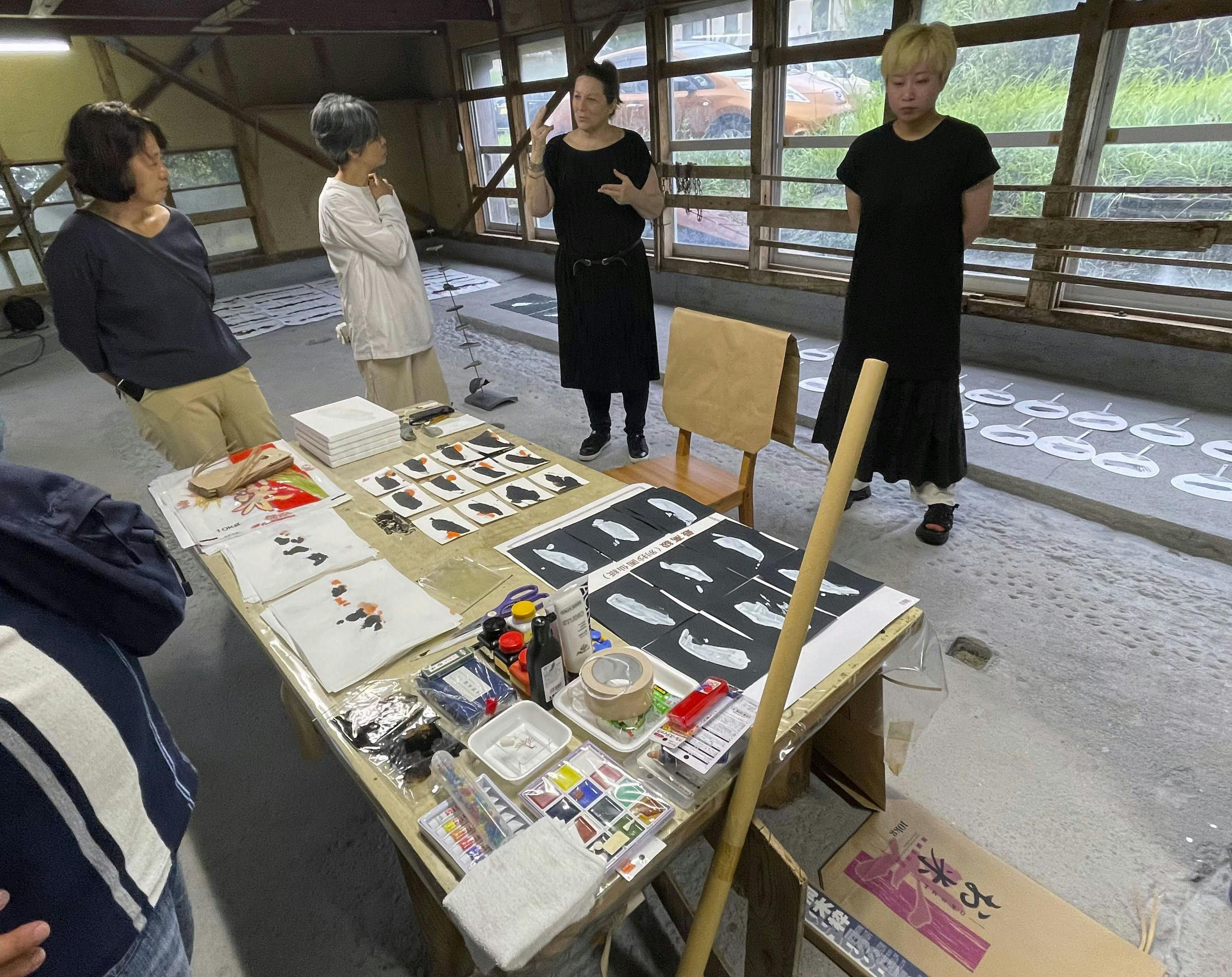 2024/11/21 14:04こんにちは IKUHART企画 レジデンス担当の竹内です。前回書かせていただいた水没馬小屋を再生したスタジオでどのような作品が生み出されたかをご報告したいと思います。オーストリアから韓国経由で日本に来たタニアは(韓国のアート展でキュレーターをしておられたらしいです)レジデンス滞在2日目に画材を買いに神戸のユザワヤへ。そこで墨やうちわなど日本ならではの沢山のツールを購入。(漆売ってないかと言われましたが、さすがにユザワヤにはないので、、)その後制作にかかるのかと思っていたらできたばかりのUMAYADO スタジオにこもることなく、淡路の中を見学したり篠山や東京、金沢へ出かけ様々な人と交流しておられました。おまわりさんとも仲良くなりました!淡路の名工!宮大工の江戸さんにも色々レクチャーしていただきました。淡路で生活するうちにずっとひっかかっていることがあると繰り返し言われたのが、”捨てられた瓦”です。私達なら目にもとめない程度の瓦でしたが、彼女の中ではとても大切な存在だったようです。このまま作品を作らないで帰っていくのか?と思われた滞在最後の方になって突然彼女は制作活動につながる行動をはじめられました。泳ぐはずで行ったビーチや道端で瓦のかけらを拾い、それを作品にする構想をスケッチしましたが、制作はIKUHARTのメンバーに丸投げし(笑)しばらく旅に、、、旅から帰ったタニアは滞在最終日前日のアーティストトークに向けてUMAYADO Studioにこもり猛然と作品を作りはじめました。そしてアーティストトーク当日気が付けばスタジオいっぱいの作品が飾られていました。彼女によれば「”ちゃっちゃっ”と作っているみたいだけど、そこまでくるには何十年もの修練があってこそよ!」とのことでした。日本での沢山の経験と沢山の人との交流の集大成をUMYADO Studioの空間がうまく導きだし作品を完成に導いてくれたのだと思いました。アーティストトークはUMAYADO Studioで行われ、沢山のお客さんが来られとても楽しい時を過ごしました。そして彼女が構想した瓦の作品は、今レジデンスの玄関に飾られここに滞在されるアーティスト達を迎えています。 もっと見る