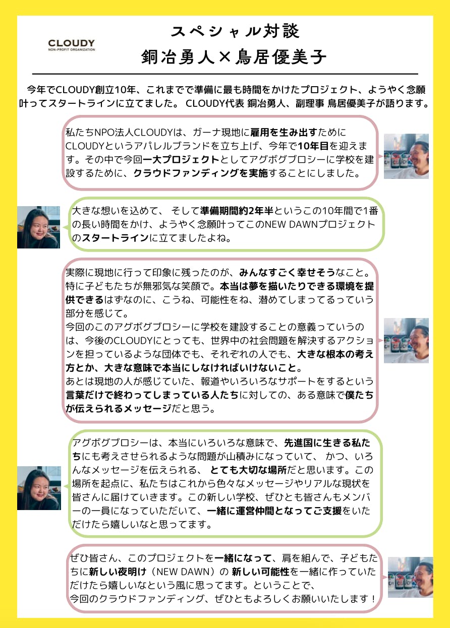 子どもたちにとってCLOUDY SCHOOLが新たな希望、新たな人生の始まりになるように。期待と夢を込めて、この地での一連の取組みについて、ガーナメンバーと共に名付けました。
