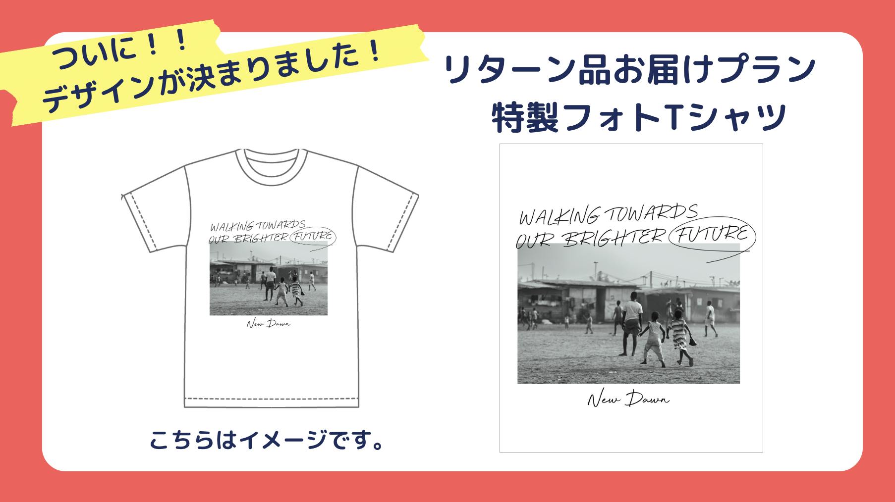 アグボグブロシーの子どもたちが遊んでいる様子のモノクロ写真がTシャツのフロントに、WALKING TOWARDS OUR BRIGHTER FUTURE(明るい未来に向かって歩く)とNew Dawn(新しい夜明け)が入っています。