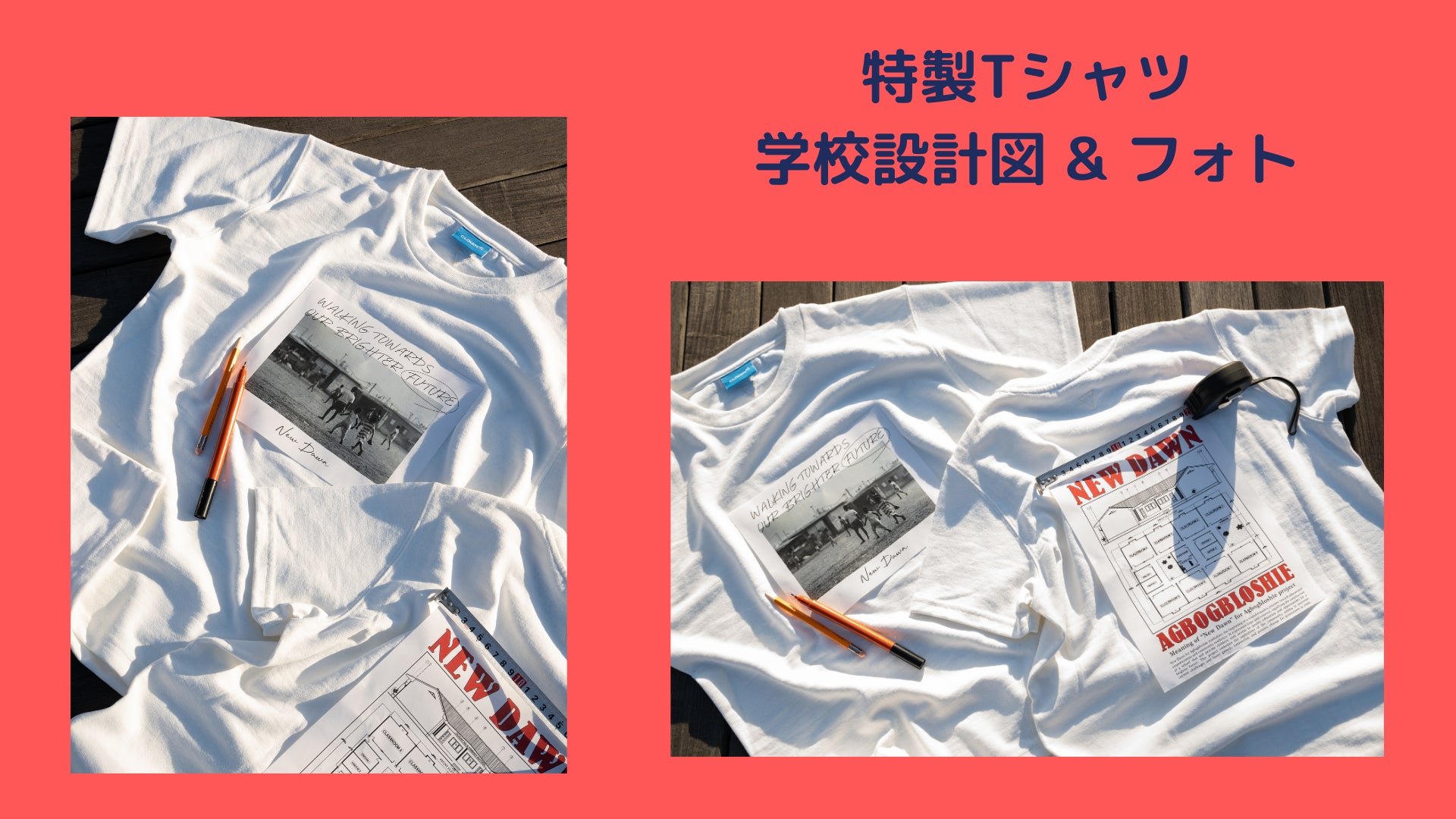 建設する学校の設計図を入れたデザイン、そして現地ガーナのCLOUDYフォトグラファーがアグボグブロシーで撮影した写真を入れたフォトT。