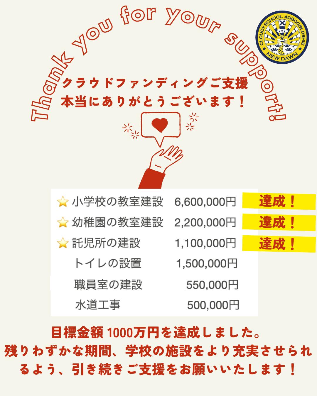 今回のクラウドファンディングの目標金額1000万円で小学校・幼稚園・託児所の校舎建設に係る費用をカバーすることができました。