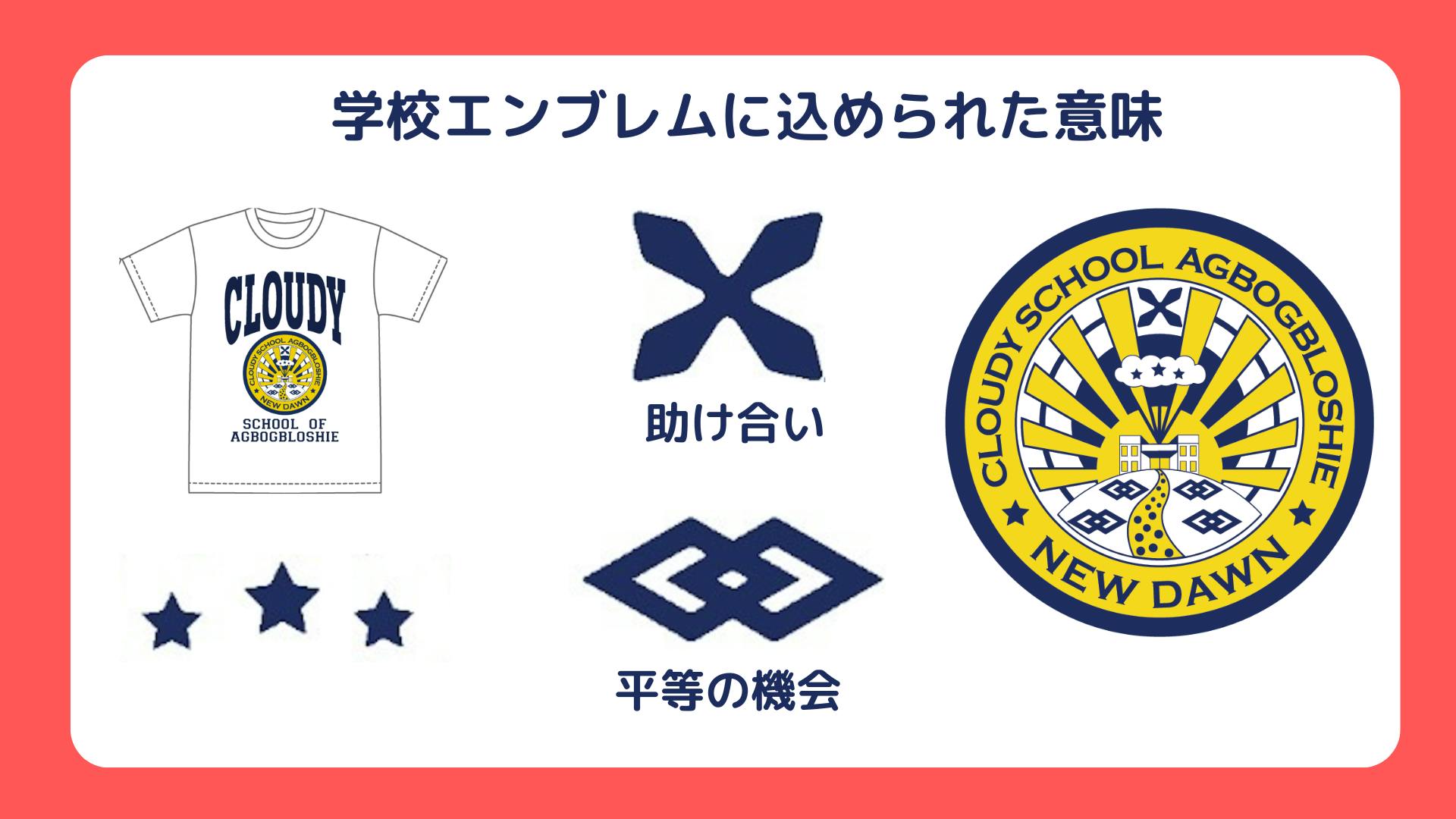 リターン品お届けプラン特製Tシャツの一つにも入っている学校のエンブレム。スクールカラーの黄色はガーナで豊さ、紺色は知識を意味します。CLOUDY SCHOOLが子どもたちにとって、たくさんの知識を学び、未来へと繋げていく豊かな場所であるようにと願ってこの色を選びました。今回の学校建設のプロジェクト名である"NEW DAWN(新しい夜明け)"をデザイン全体に表現。地球から太陽の光が差し込み、新しい夜明け、新しい時代や新たな希望、未来の幕開けを表現しています。学校に続く道に表現されたドットは生徒を表しています。象徴となる校章に記された2つのアディンクラ。上部に描かれたバッテンの形のアディンクラは助け合いやチームワークを意味しています。このシンボルは彼ら自身の生き方を象徴していて、助け合い生き抜いている力強さを表現しています。生徒を囲うアディンクラマークは平等を意味しています。皆が平等に教育を受けられる機会を届けたい。そんな願いが込められています。校舎から光刺す先に描かれた雲と星3つ。この星には3つの意味が含まれています。1. 子どもたちに大切にしてほしい3つの言葉 創造性・コミュニケーション・好奇心2. 心・体・魂 の3つのつながり。 3. 誕生・生きる・死 の3つのサイクル。たくさんの想いが詰まったエンブレムの入っている特製Tシャツを、リターン品として是非ご検討ください。