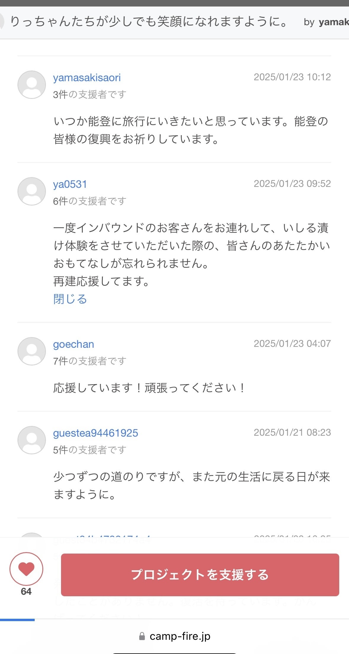 全国から能登に、へぐら屋に、応援のお声やご支援をいただいています。リターンでご協力いただいている企業さんや、お世話になっている皆様に、応援メッセージをいただいており、
