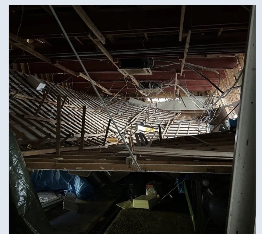 ▼業務用エアコンが天井ごと落ちてむきだしの断熱材、いまだ修繕できていません。
