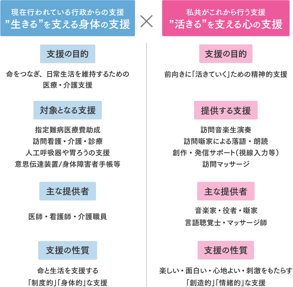 ALS患者様をはじめ、寝たきりの生活を送られている方々に向けて、現在はほとんど提供されていない「心のケア」と「癒し」の時間を、継続的にご自宅へ届ける訪問サービスを実現したいと考えています。(現在、行政からは十分に提供されていない支援です)