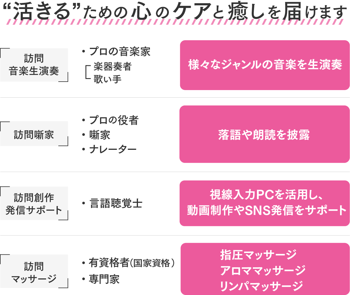 楽しい、感動、面白い、刺激、気持ち良い、様々な心のケアと文化と癒しを患者様のご自宅へもっていきます!!