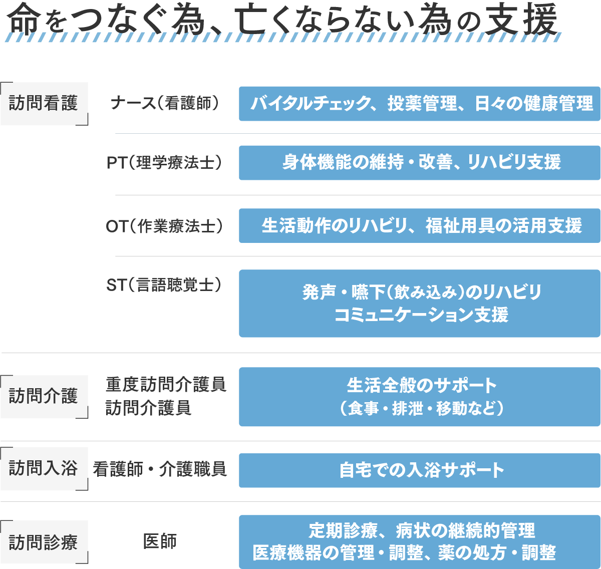 ※現在はALS患者様への訪問支援からスタートしておりますが、今後は寝たきりの生活をされている他のご病気の方々にも対象を広げていく予定です。