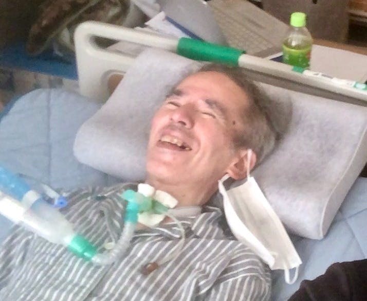 ALSが進行すると、呼吸に必要な筋肉が弱り、自力で呼吸ができなくなります。この状態になると、気管切開をして人工呼吸器を装着することで、呼吸を補助し命をつないでゆきます。