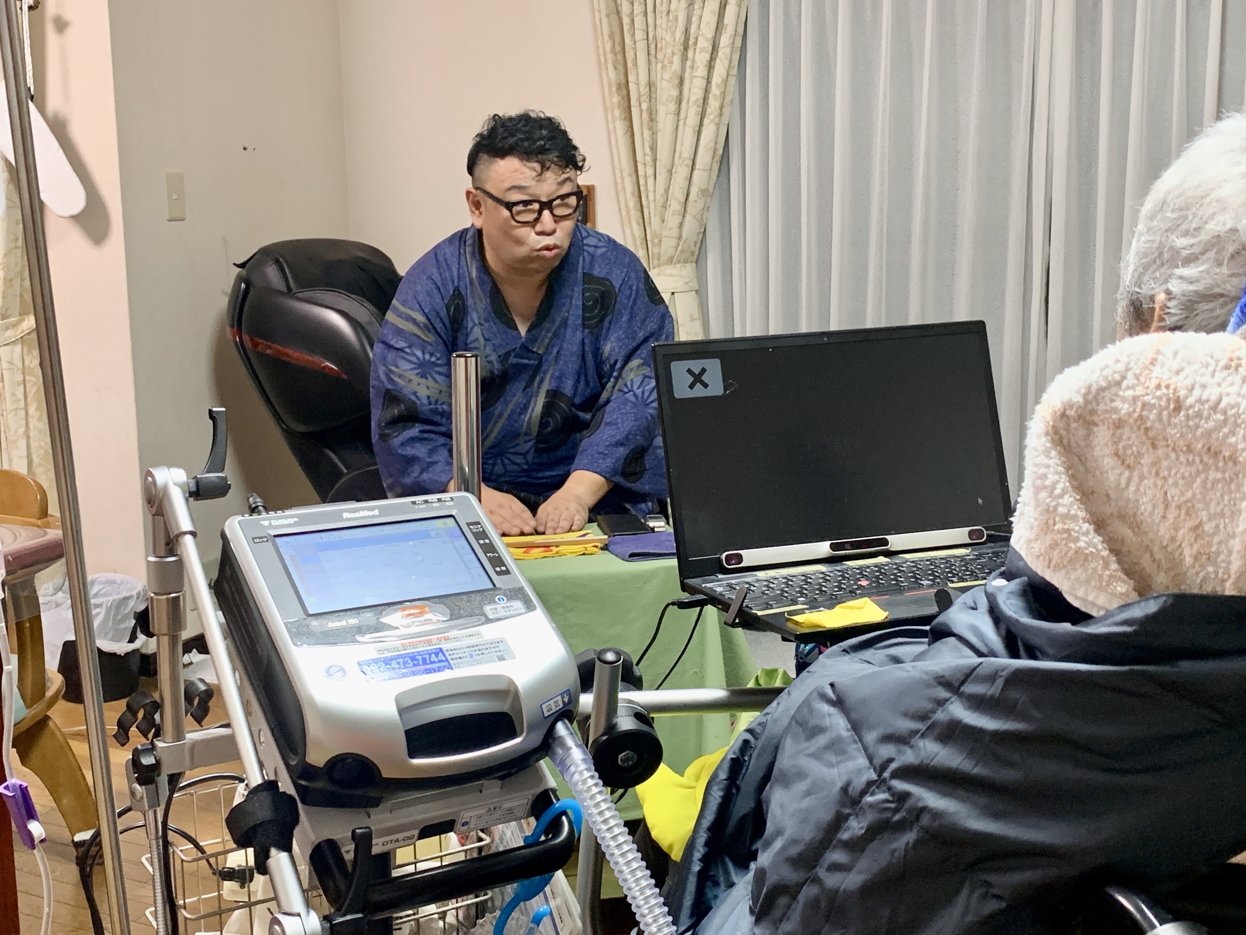 2025年9月20日 お二人目のご訪問 噺家:岡本ヒロミツ 参加者:ALS患者様(60代男性)、介護員さん1名、ご家族3名、ENOTNスタッフ1名岡本氏はご自身で出囃子を奏でながら登場し、着席。自己紹介や落語についてのお話を交えつつ、枕から演目へと進みました。 ご家族や介護員さんからは大きな笑い声があがり、場がとても明るい雰囲気に包まれました。私は患者様の後ろから拝見していたため表情は見えませんでしたが、きっと一緒に笑ってくださっていたのではないかと思います。終演後には患者様とご家族の皆様と談笑の時間を持ちました。患者様はPCの視線入力で会話され、そのやりとりもまた温かく心に残るひとときとなりました。本当に楽しく、心が和む時間でした。