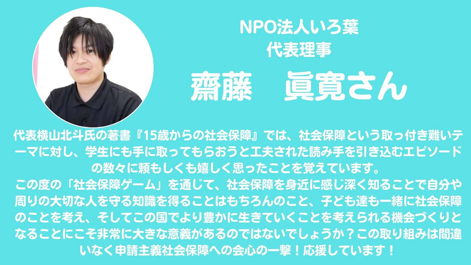 齋藤さんには代表理事の横山の著書「15歳からの社会保障」の第6章の監修をいただくなどサポートいただきました。齋藤さん、ありがとうございました!