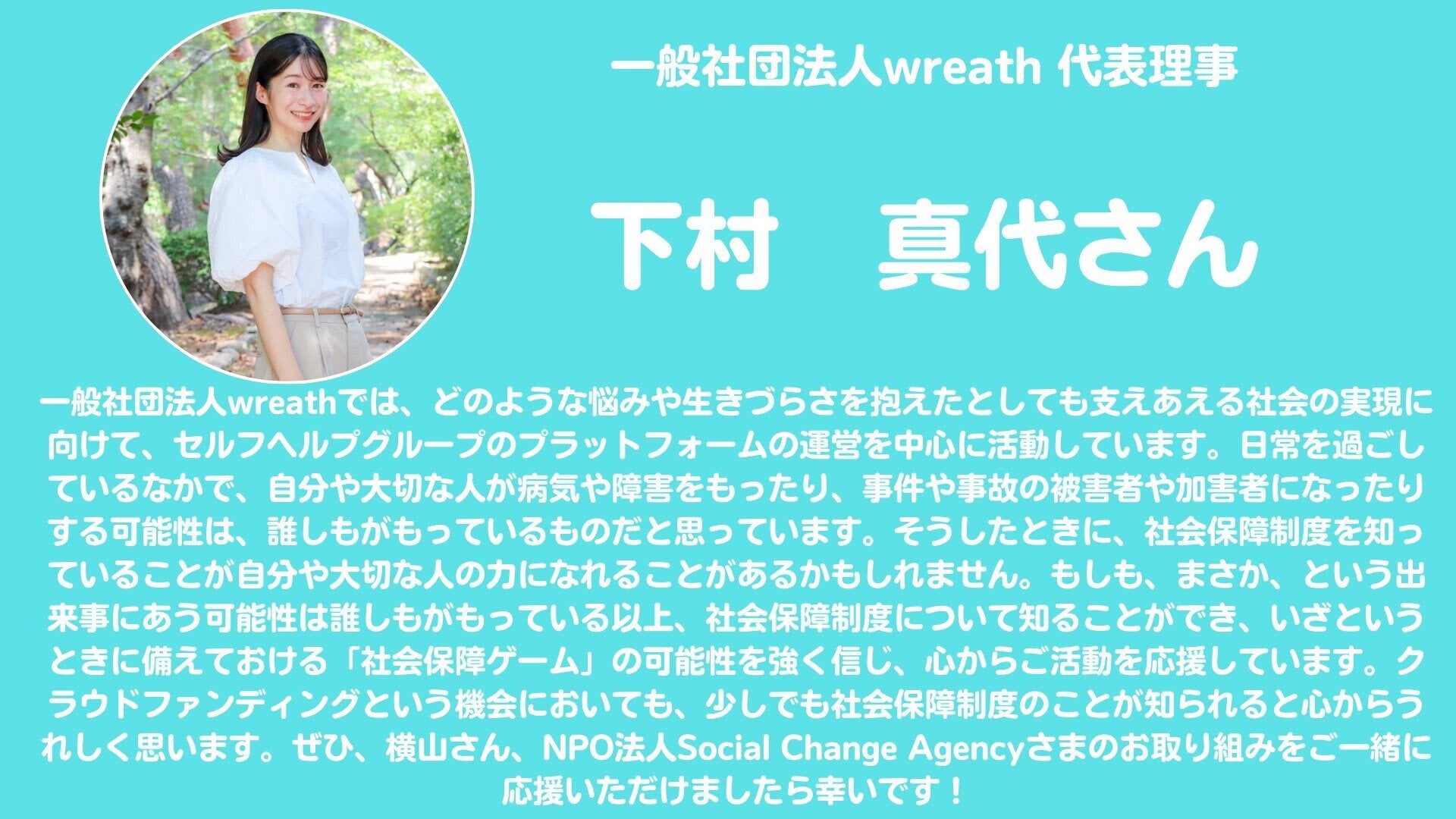 "一般社団法人wreathでは、どのような悩みや生きづらさを抱えたとしても支えあえる社会の実現に向けて、セルフヘルプグループのプラットフォームの運営を中心に活動しています。日常を過ごしているなかで、自分や大切な人が病気や障害をもったり、事件や事故の被害者や加害者になったりする可能性は、誰しもがもっているものだと思っています。そうしたときに、社会保障制度を知っていることが自分や大切な人の力になれることがあるかもしれません。もしも、まさか、という出来事にあう可能性は誰しもがもっている以上、社会保障制度について知ることができ、いざというときに備えておける「社会保障ゲーム」の可能性を強く信じ、心からご活動を応援しています。クラウドファンディングという機会においても、少しでも社会保障制度のことが知られると心からうれしく思います。ぜひ、横山さん、NPO法人Social Change Agencyさまのお取り組みをご一緒に応援いただけましたら幸いです!!"