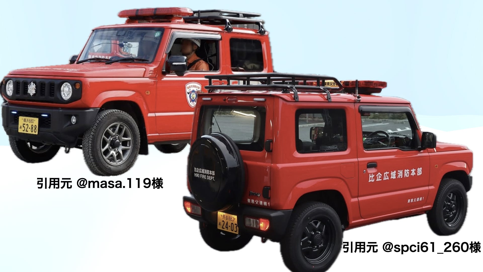 鎌倉市消防本部 大船消防署の災害多目的車(左)と比企広域消防本部 小川消防署東秩父分署のジムニー連絡車(右)
