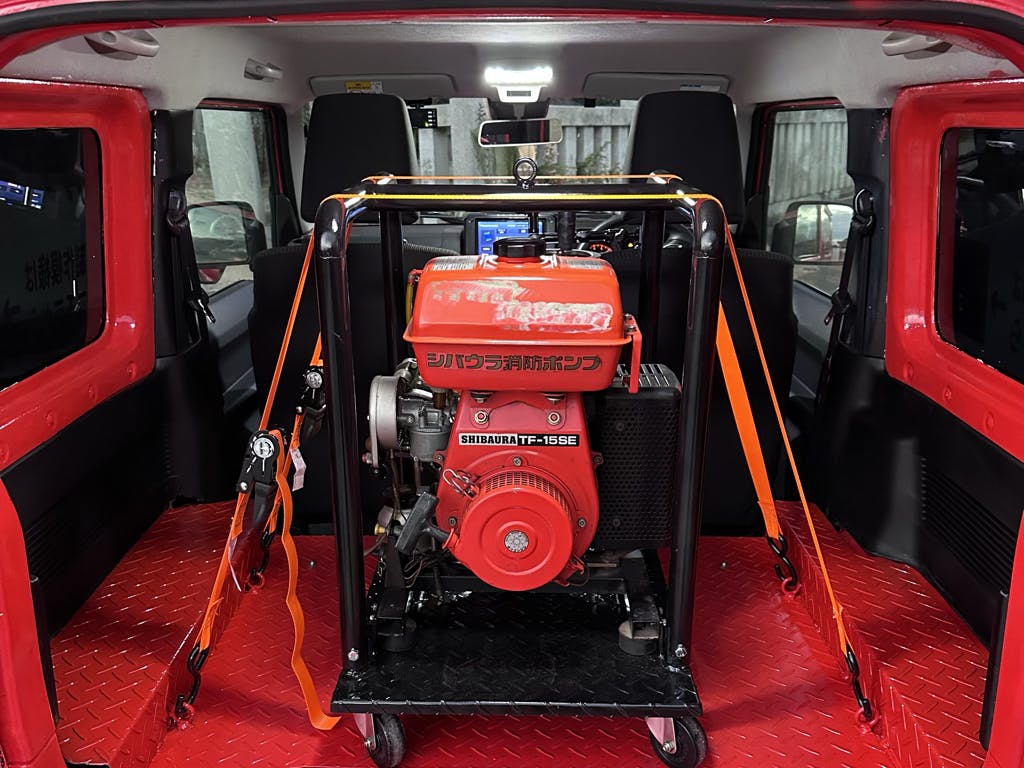 現在の状況は荷台が完成し、消防ポンプを積むところまでいきました。これから引き出しレール制作、ホース巻取り機制作に取り掛かります!