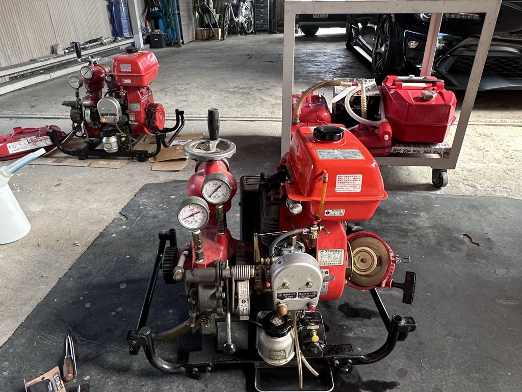 お世話になっている方から、ご好意で譲ってもらった、可搬消防ポンプ2台。正面のポンプがメインで後方にあるのが部品取り用です。シバウラ製 TF-15。C-1級と呼ばれるもので小型のポンプになります。しかし威力は十分にあります。1987年製のもので、かなりの期間不動とのことで、譲ってもらった方からアドバイスをもらいながら自分で動かせるようにしました。メンテナンス的には主にキャブレターの部品交換、掃除等や燃料タンク入れ替えです。修理の要領が分からず苦労しましたが、無事に始動しました。苦労した分、愛着も湧いた、これからの僕の相棒です!