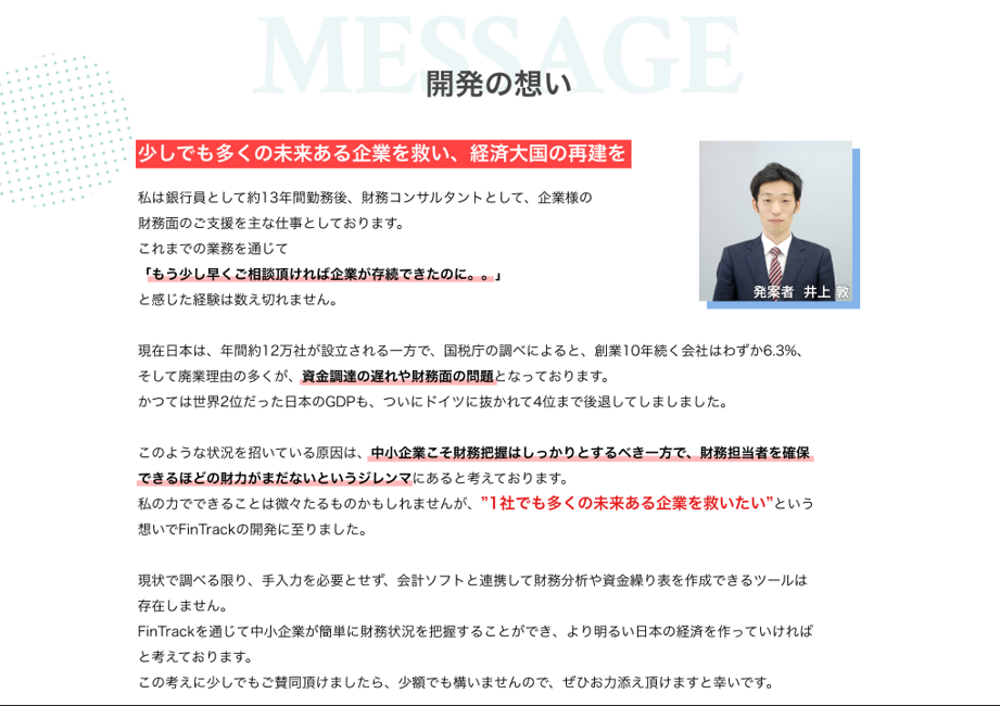 私の力でできることは微々たるものかもしれませんが、"1社でも多くの未来ある企業を救いたい"という想いでFinTrackの開発に至りました。