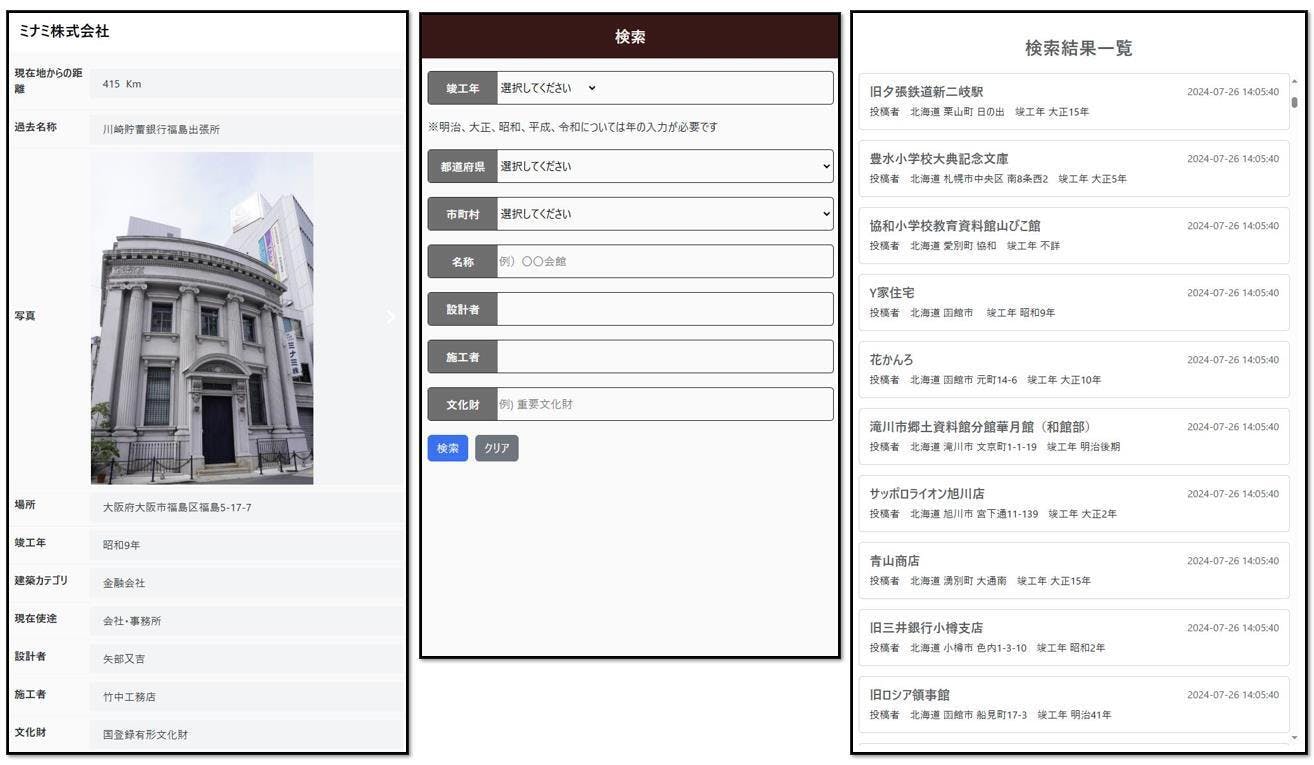 興味のある建築に出会うと、「他にこの設計者の建築にどのようなものがあるのか」とか、「他に大正期に建てられた銀行の建築も知ってみたい」など、知的好奇心が刺激されました。そのため、旧アプリは、投稿とのリンクだけでしたが、今回の開発に際しては物件名称だけでなく、設計者、竣工時期、使途など物件に共通する基礎情報を搭載し、複合的に検索できたらなお良いアプリになるのではと考えました。