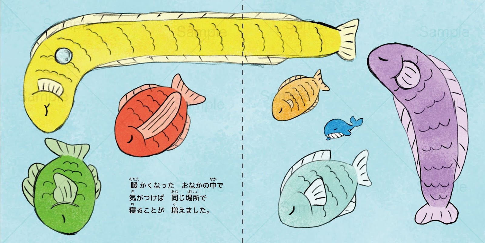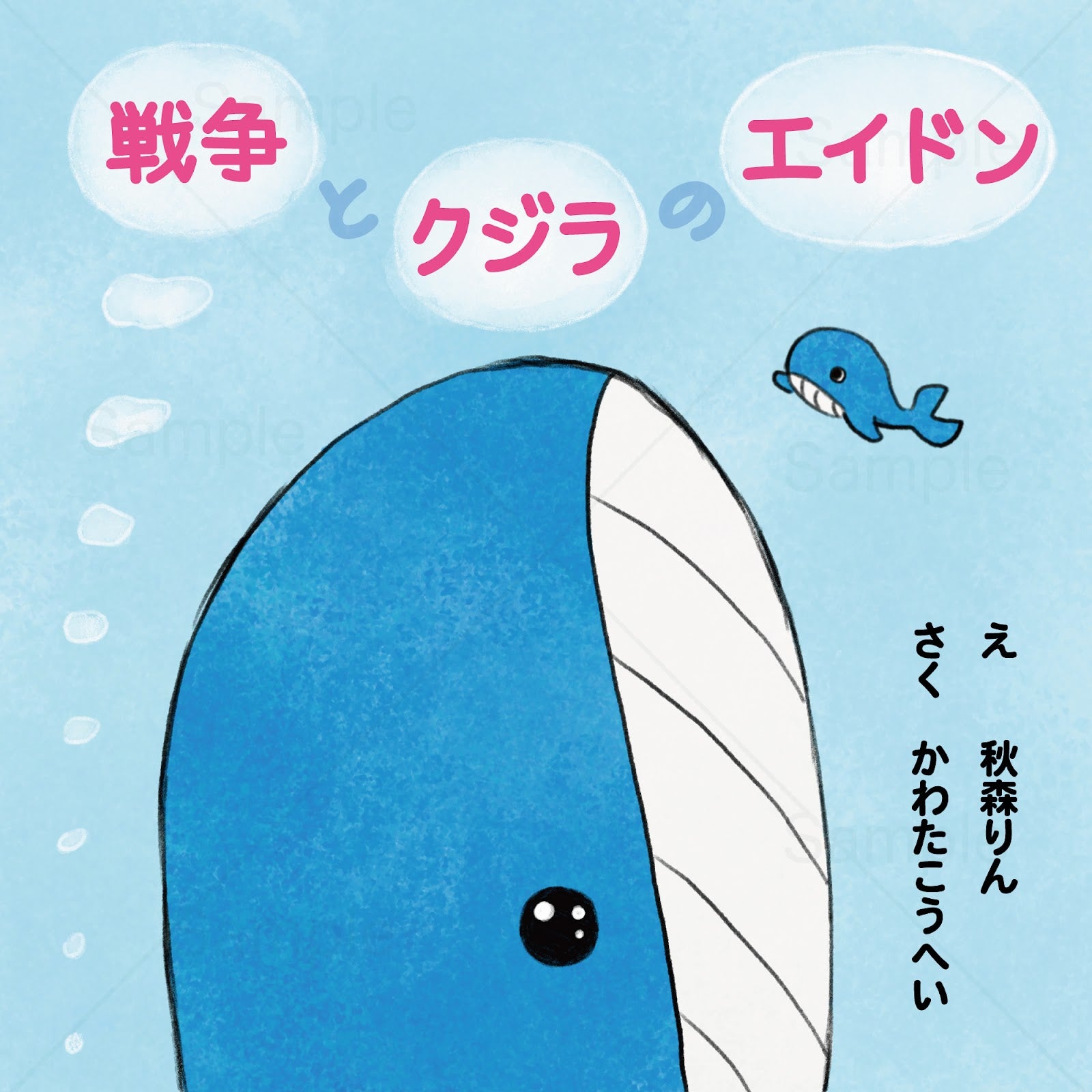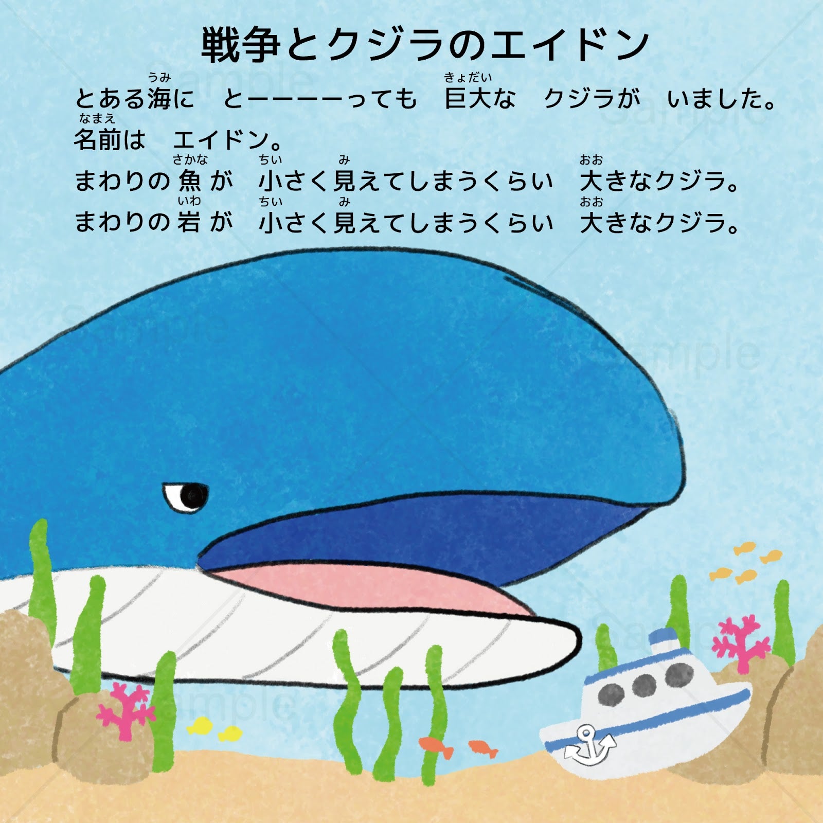 絵本『戦争とクジラのエイドン』の主人公は巨大なクジラ・エイドン。海を支配することを夢見るエイドンは、強くなるために魚6匹を捕まえてお腹の中に入れます。