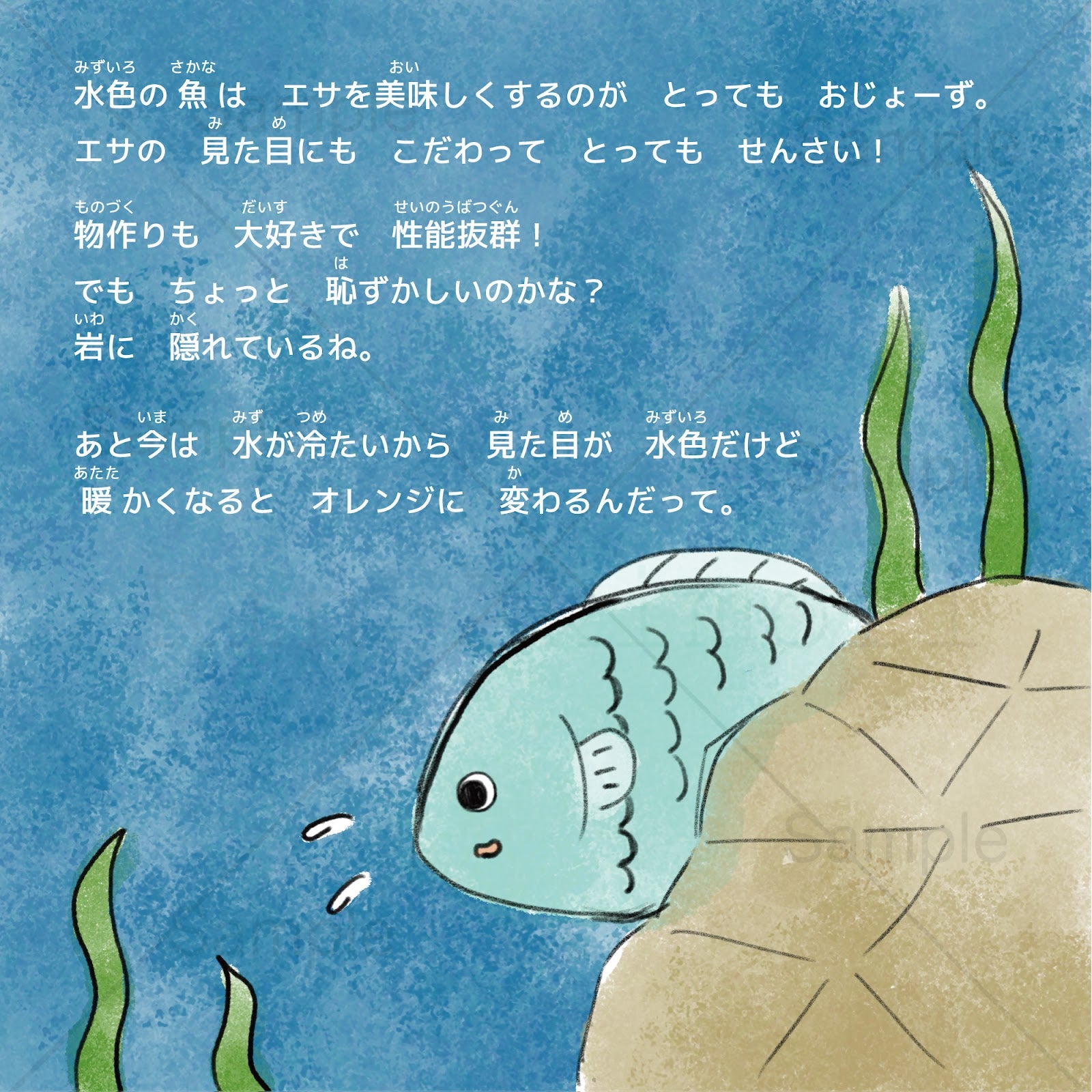 水色の魚は物作りが大好き。ただ、ちょっぴり恥ずかしがり屋さん。水温が上がるとオレンジに変化する特徴があります。