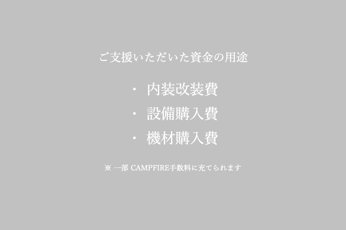 クラウドファンディングでご支援いただいた資金は、「UNION」のテーマである「飲・食・音」のイベント運営に必要な、内装改装費、設備購入費、機材購入費、CAMPFIRE手数料に充てさせていただきます。