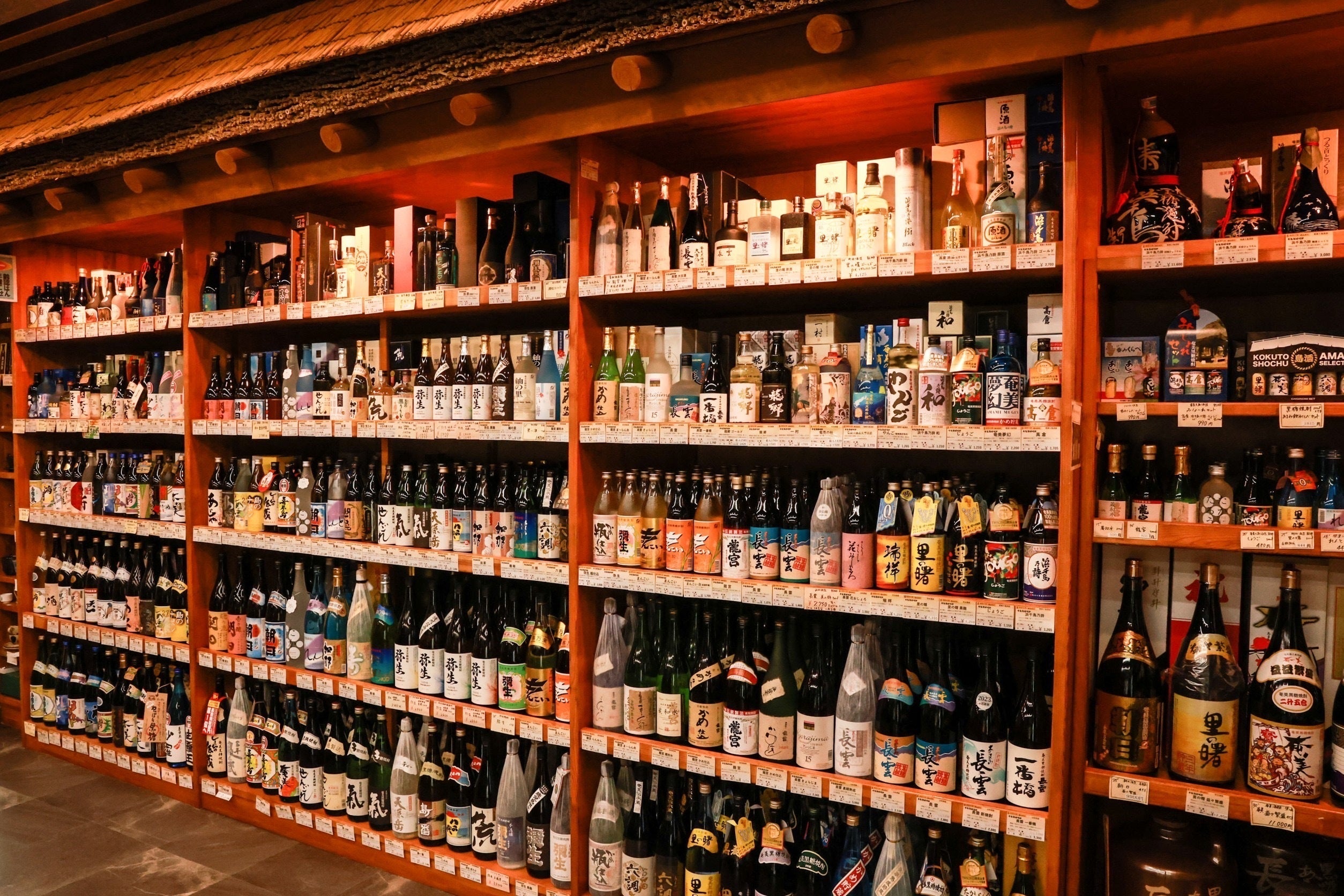 多種多様な黒糖焼酎が並ぶ酒屋まえかわの商品棚