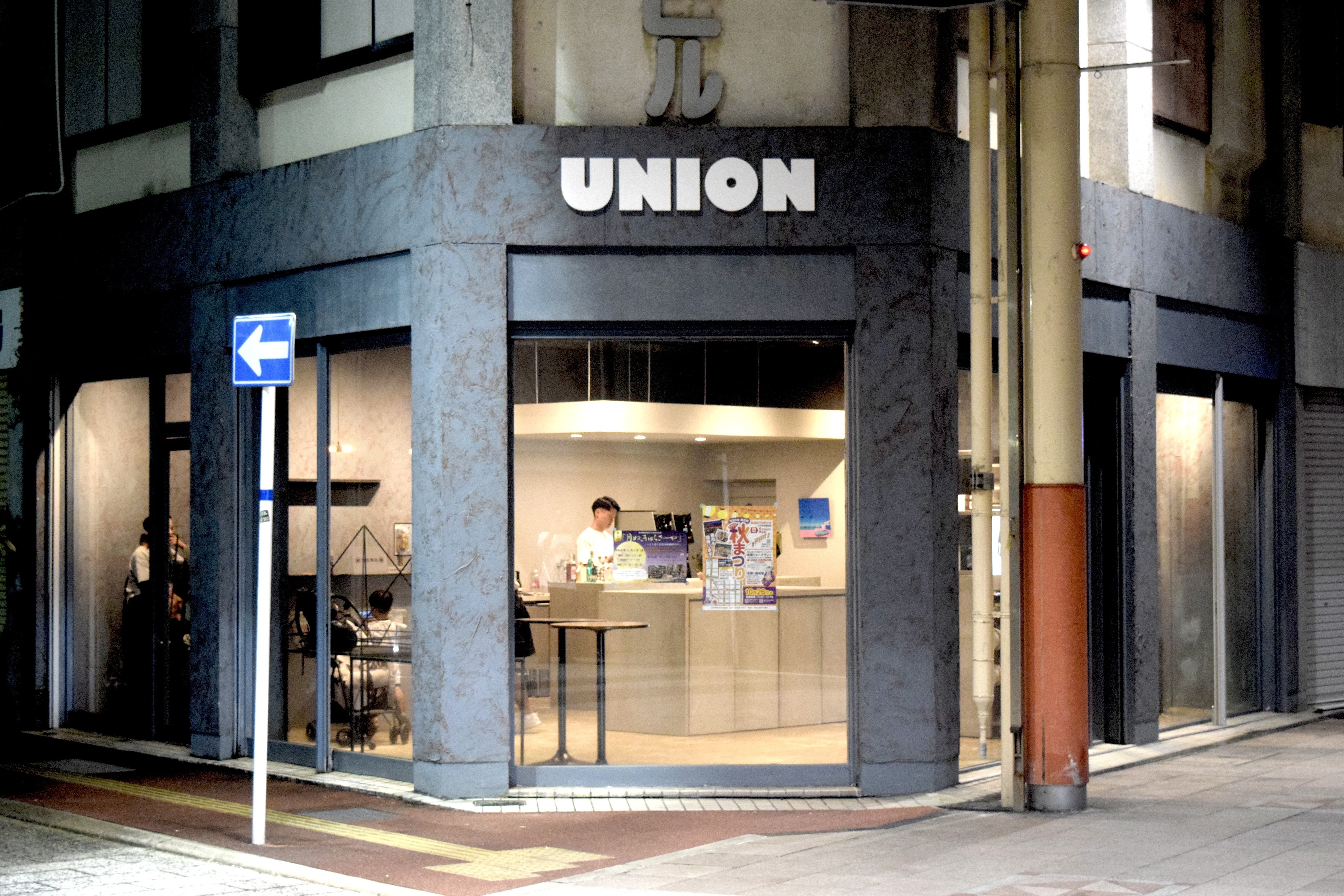 「UNION(ユニオン)」の場所は、なぜまち商店街の中心地にあるガラス張りの建物です。ここは以前、黒糖焼酎メーカー「西平酒造株式会社」さんのアンテナショップ「KANA du NISHIHIRA(カナドニシヒラ)」がありました。