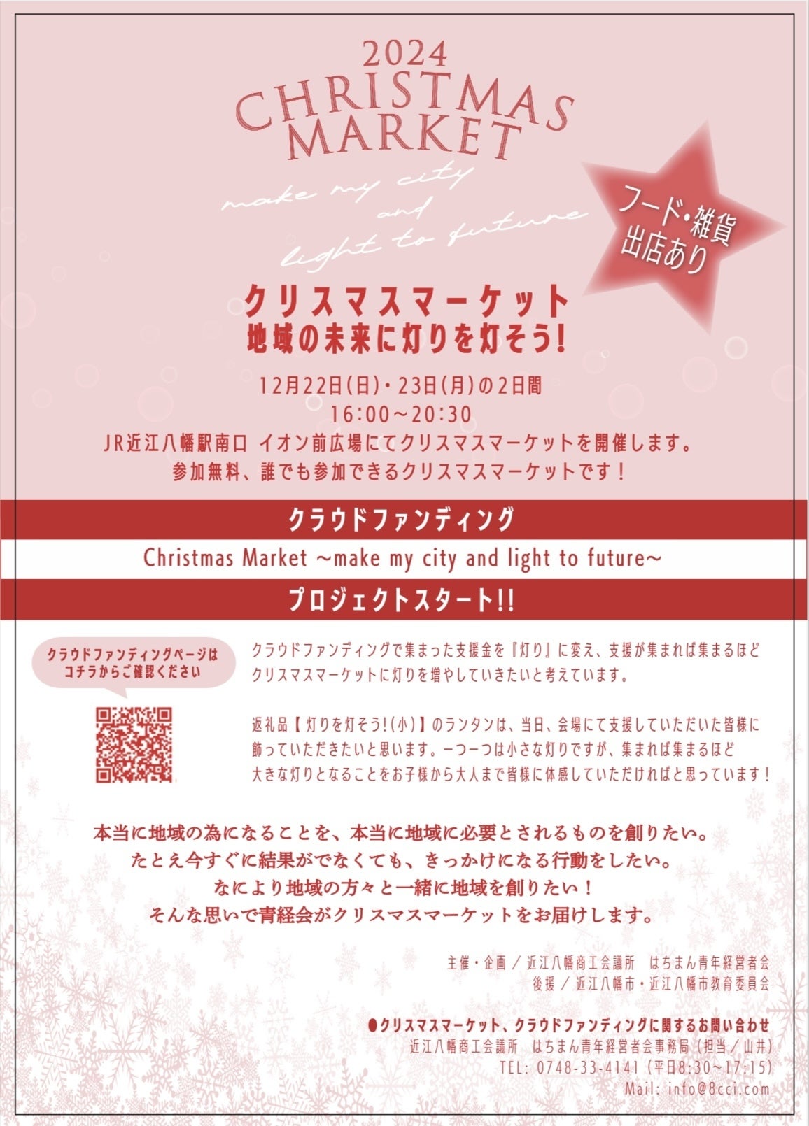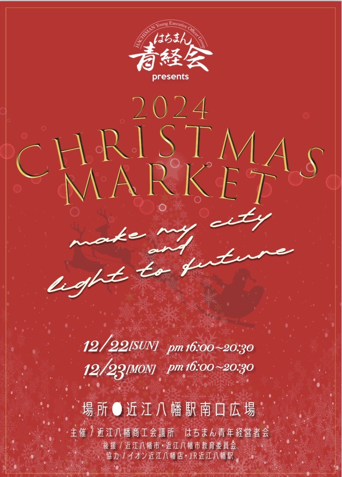 そして、イオン近江八幡店様、JR近江八幡駅様、皆様に心より感謝申し上げます。 このクリスマスマーケットを通じて少しでも地域の輪が広がり、繋がりが増え、また街が未来に進む。そんな部分に想いを持ってとり組んでみたいと思います。 なにぶん初めてのイベントですので、不完全なところばかりですが、暖かく応援してくださいますと幸いです。 何卒、宜しくお願い申し上げます。