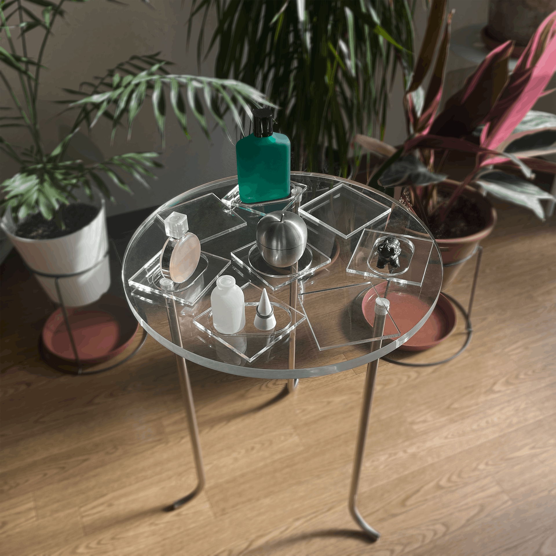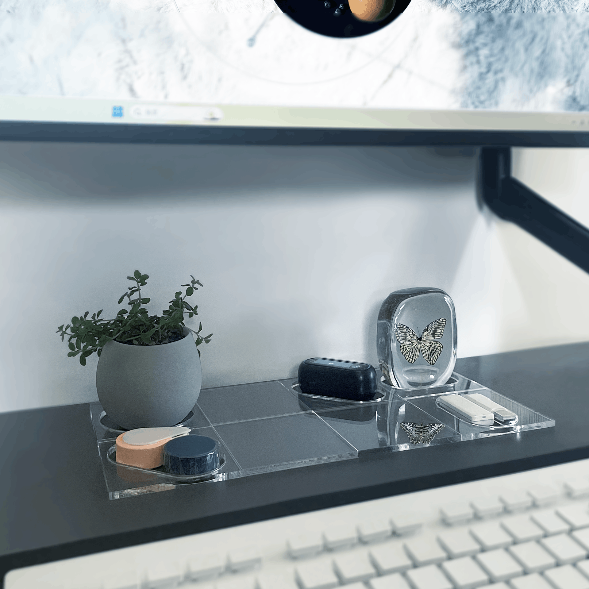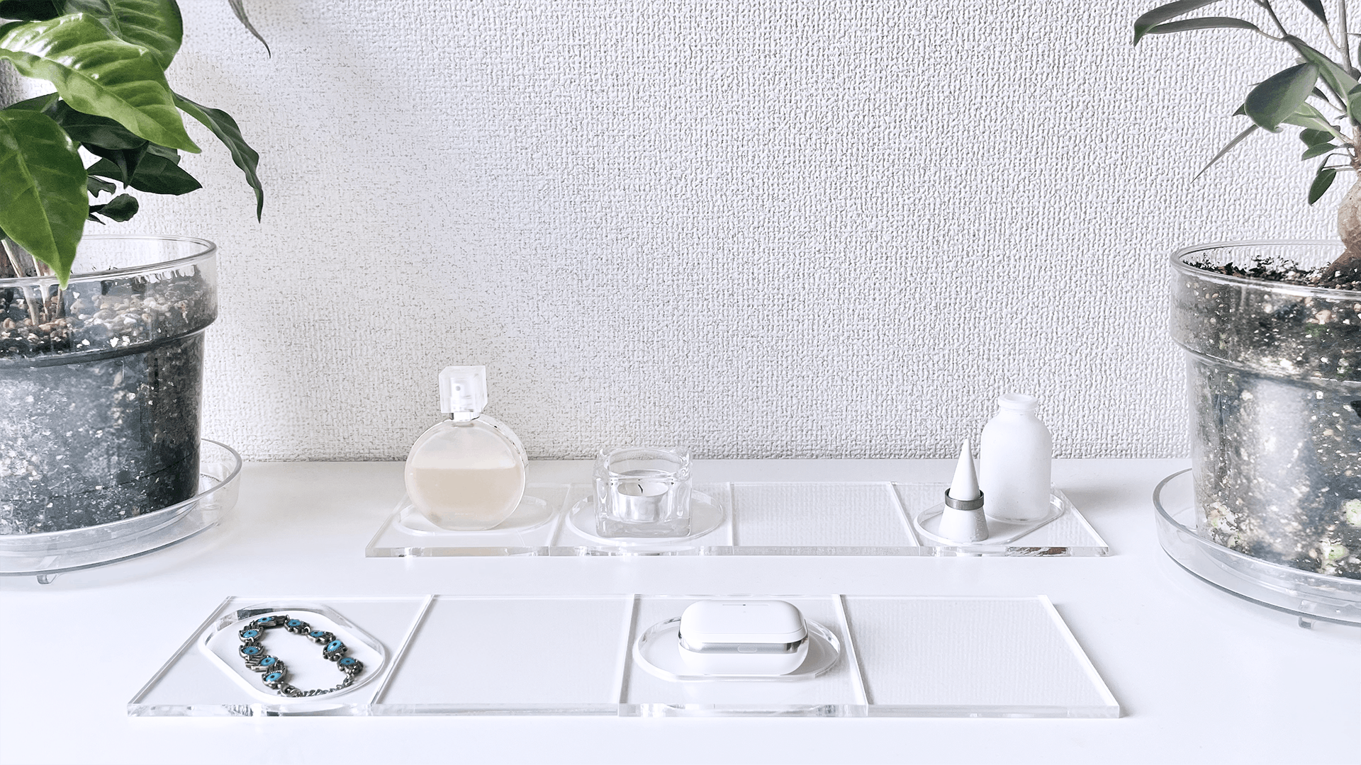 穴の開いた部分にお気に入りの物を置き定位置を与える事で、展示しているかの様に美しく魅せる事が出来ます。