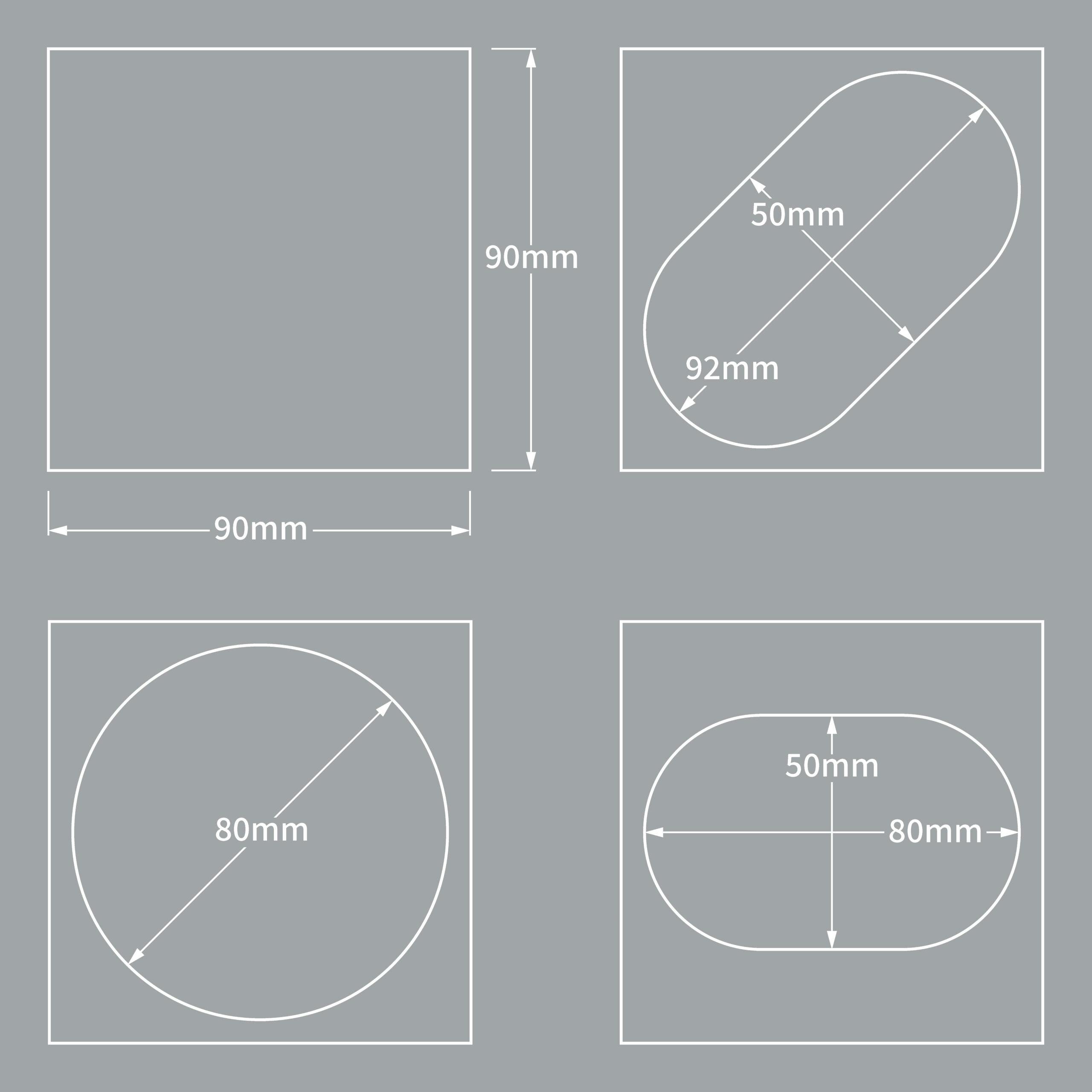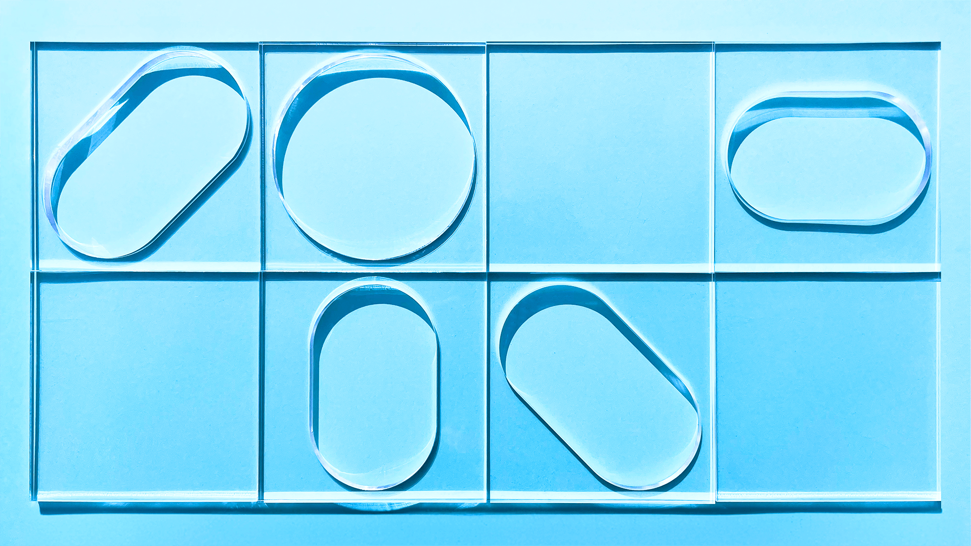 3種類の穴の開いたパネルと余白を生み出すパネルの合計8枚を組み合わせるディスプレイ。