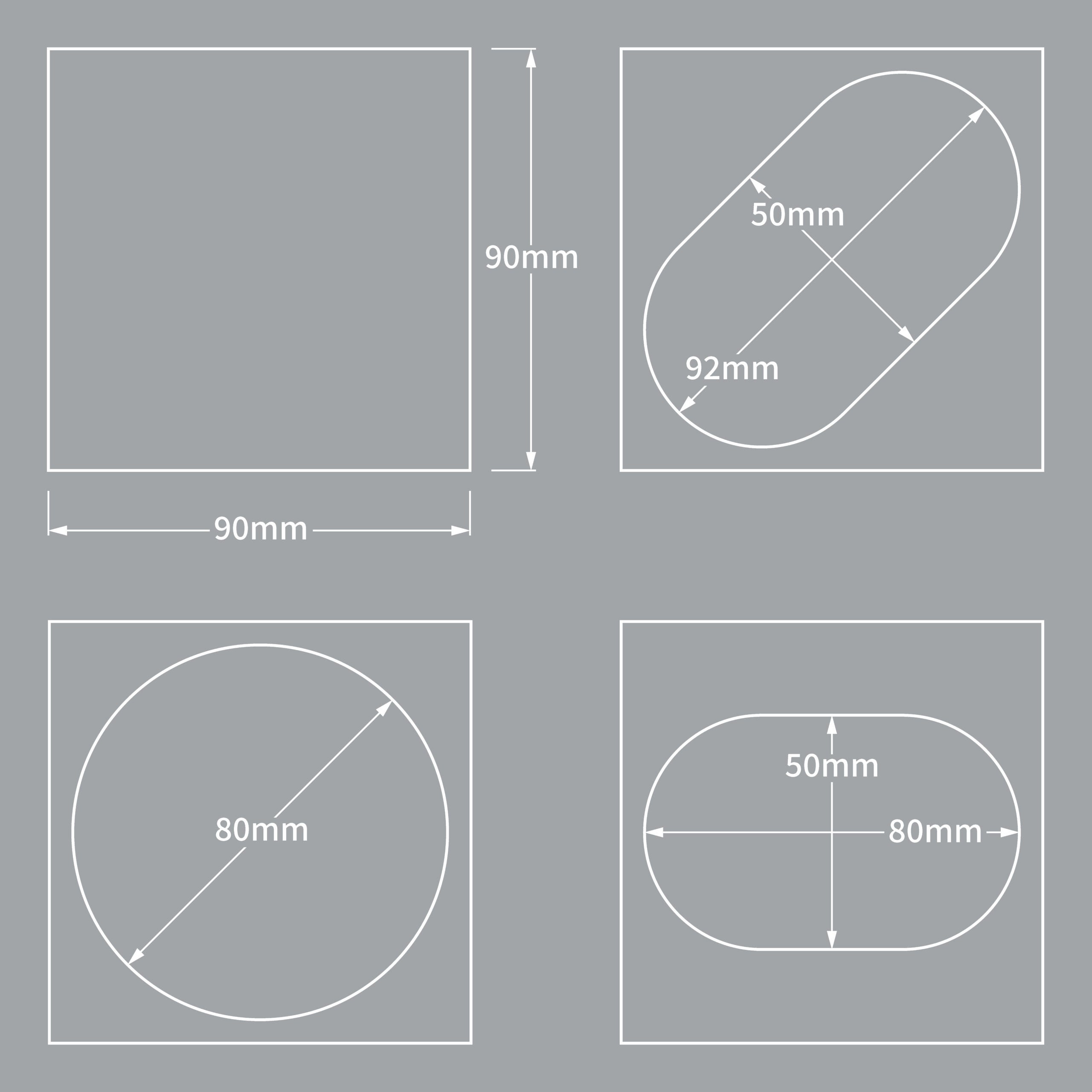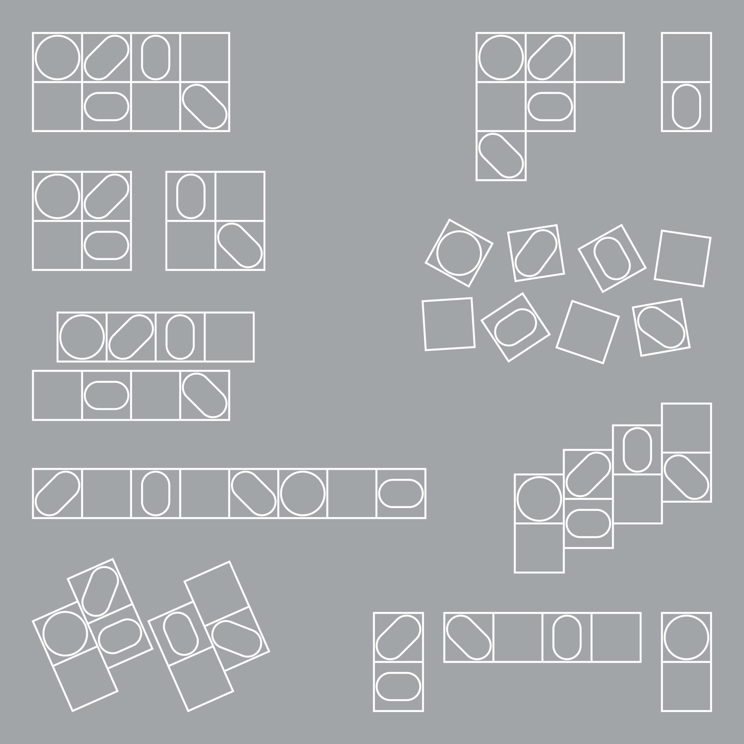 3種類の穴の開いたパネルと余白を生み出すパネルの合計8枚を組み合わせるディスプレイ。