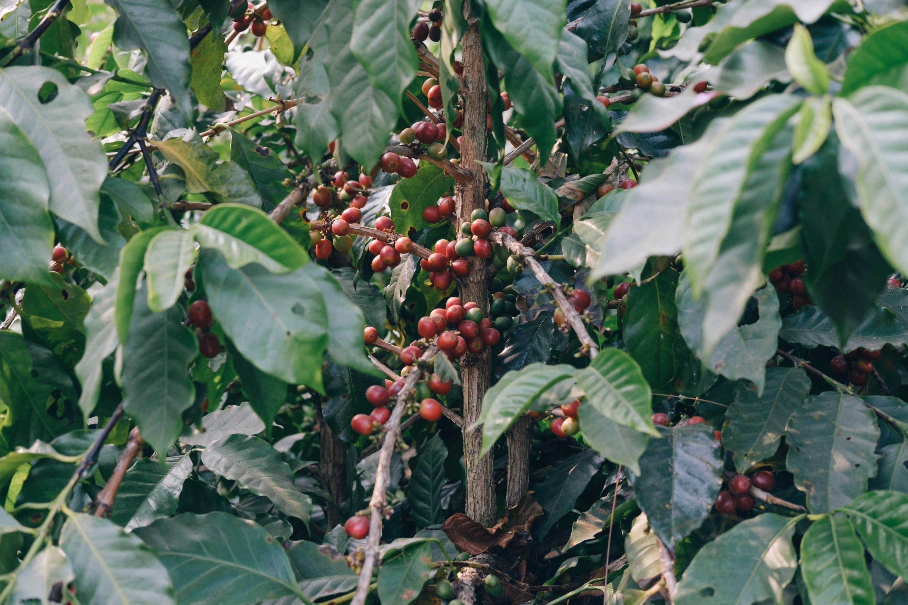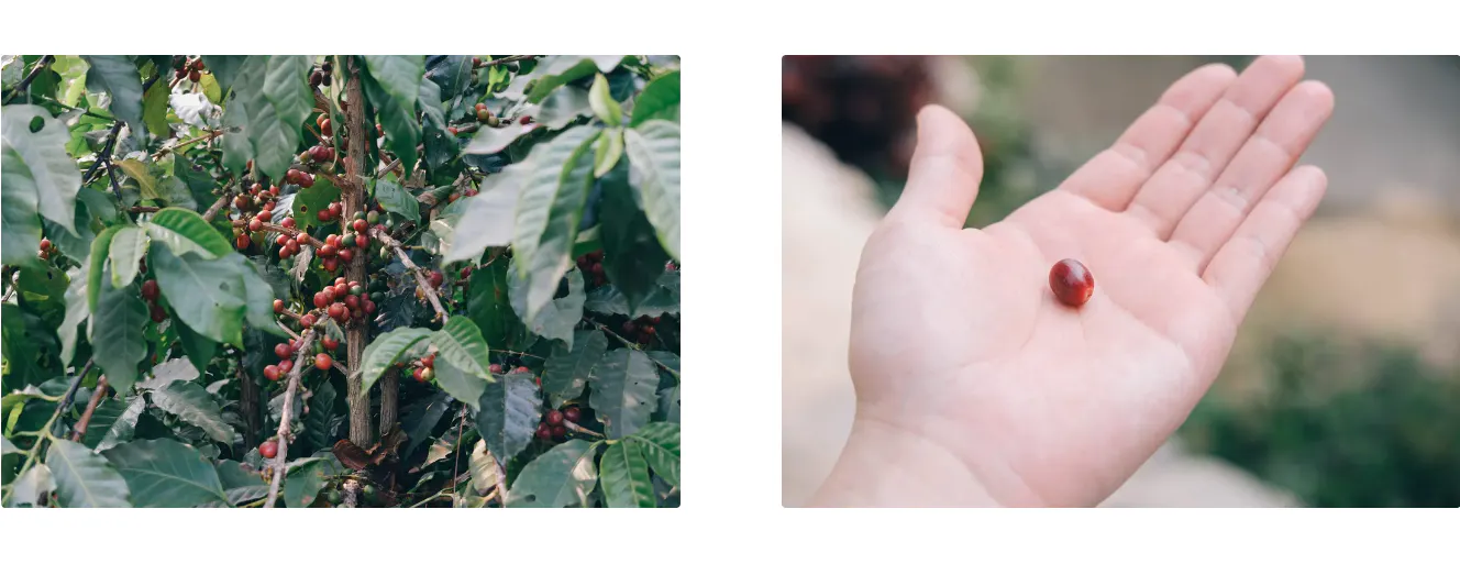 コーヒーの果実は真っ赤なチェリーのような姿でコーヒー樹(コーヒーノキ)に実ることから、「コーヒーチェリー」と呼ばれています。このコーヒーチェリーの種子が、コーヒー豆となります。