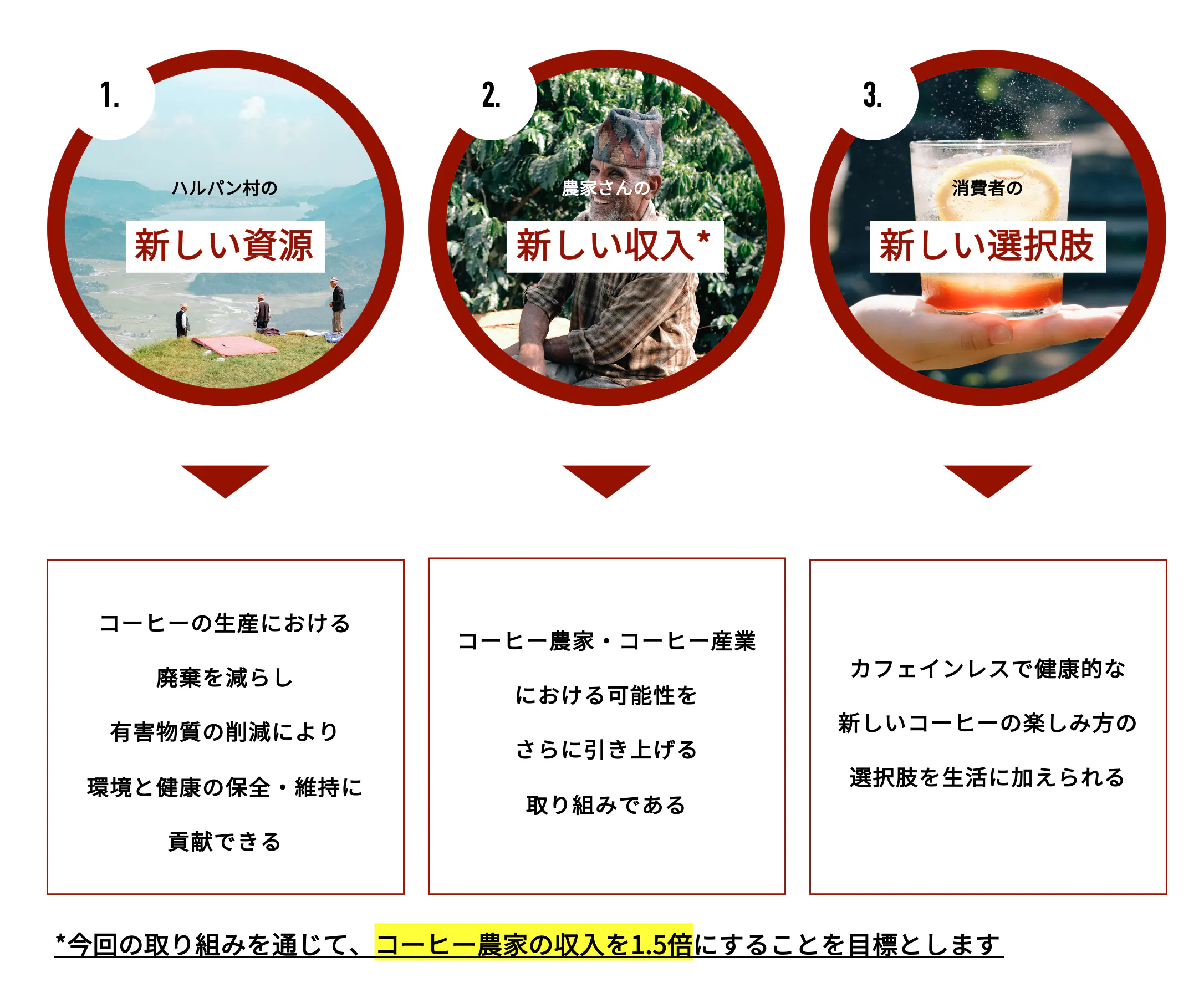 この取り組みを通じて、農家さんの暮らしの中から生まれた新しい挑戦を応援するとともに、消費者にとっても斬新でカフェインレスな新しいコーヒーの楽しみ方を提案します。