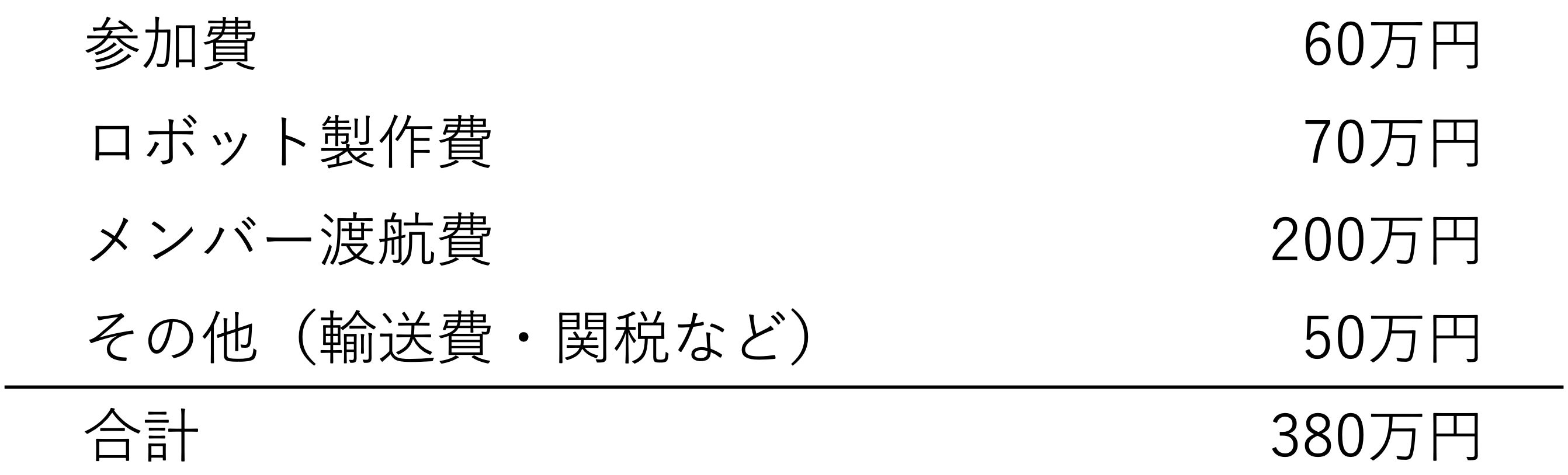FRCに参加するためには、参加費として60万円、ロボットの開発費として70万円、大会への渡航費200万円など多額の資金が必要となります。