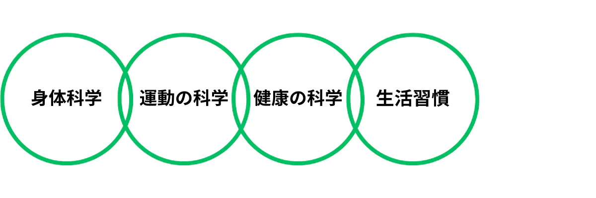 身体、運動、健康の科学、食事や睡眠など生活習慣指導まで幅広く学び提供し、様々な悩みを解決に導き、目的達成に向け健康的で効果的なプログラムを提供する。