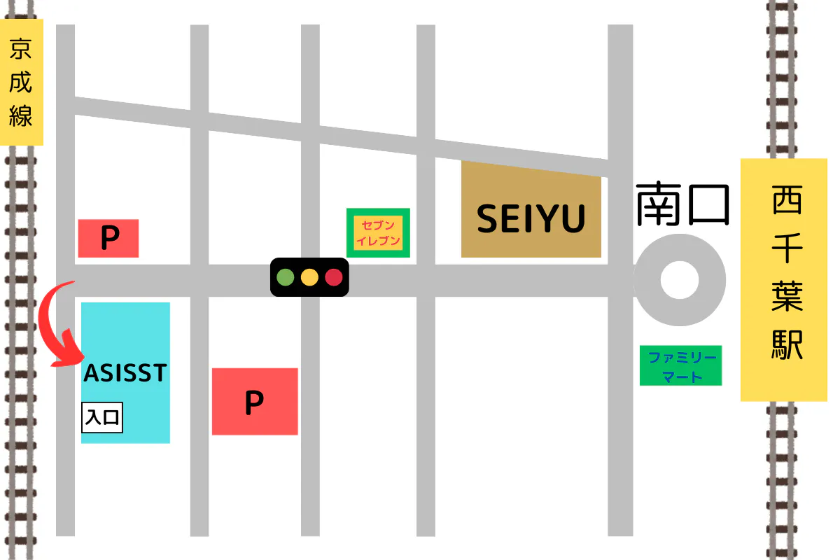 ▶改札口を出て左に進み、線路沿いに歩きます。左側に陸橋が見えてきたら、右側にASSISTがあります。