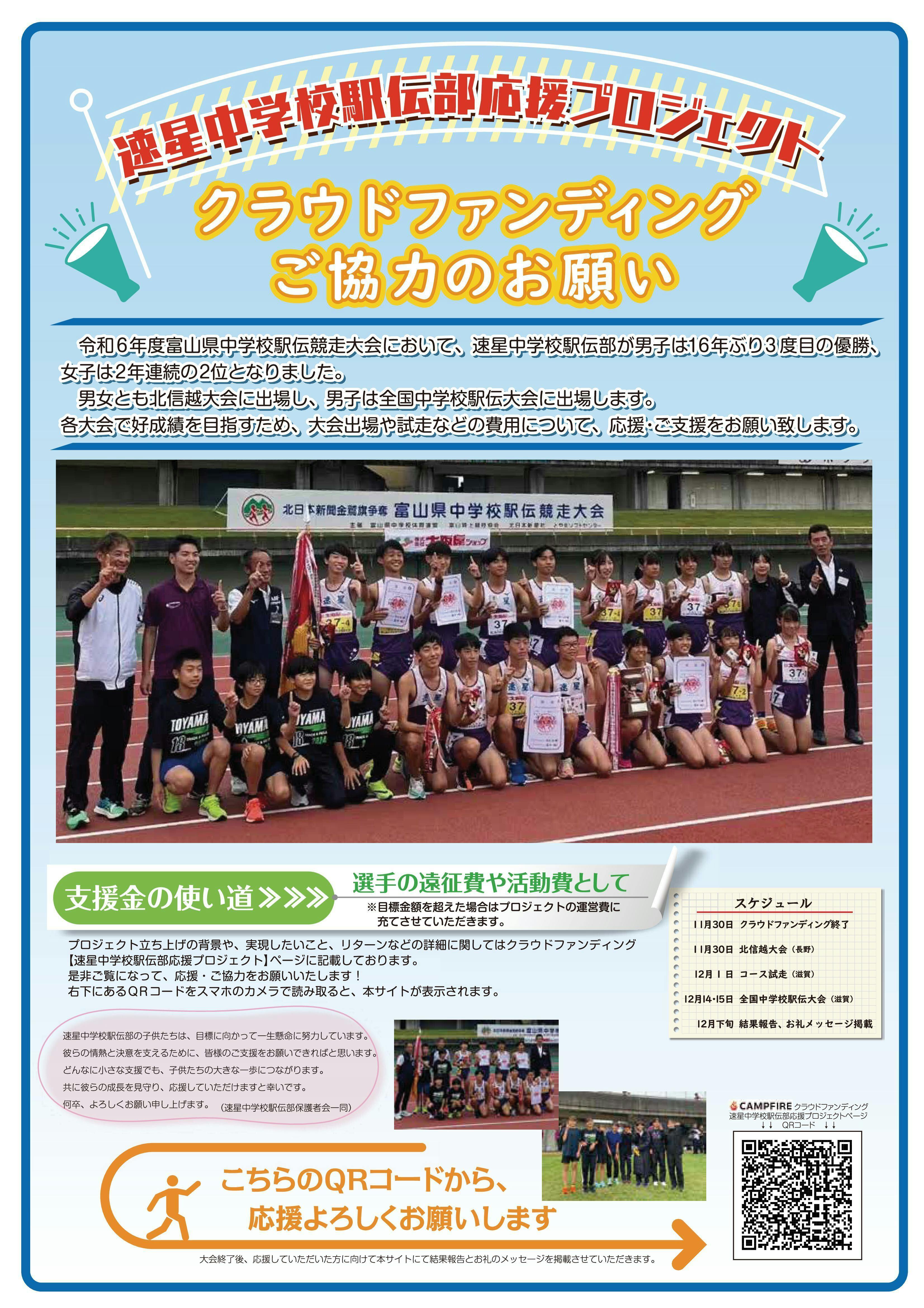 皆様のご協力により、当初の想定を超えたご支援をいただき目標を達成することができました。ありがとうございます!目標達成となりましたが、【NEXT CHALLENGE】と題しまして、目標金額 50万円 → 65万円とし、プロジェクト期間終了まで引き続きご支援をお願いしたいと思います。引き続きご協力いただけると幸いです。よろしくお願い致します。また新規でのプロジェクトポスター掲示やご支援もいただいております。ありがとうございます!上段:魚正 様中段:スーパーフレック 様へアサロンル・アンジェ 様下段左:小杉スポーツ富山店 様下段右:へアサロンル・アンジェ 様新規プロジェクトポスター掲示ご協力者様(50音順敬称略)小杉スポーツ富山店スーパーフレックへアサロンル・アンジェ本日までにご支援いただいた店舗・企業・団体様(50音順敬称略)Atelier ANORM鵜坂体育協会おき接骨院株式会社朝日株式会社中村組株式会社宝来社公文式速星教室神戸屋神明店酒処・食べ処 たか篠川整形外科クリニック中華そばだゐち中本工業長岡工業株式会社ハッピー食堂HEADZ·hair-worksBrownieBloom Hairmaano hair works皆口製パン所
