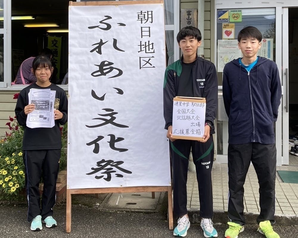 午前練と午後練の合間に『朝日地区ふれあい文化祭』にお邪魔し募金活動を行ってきました。朝日地区の山崎くん(3年)、此川さん(3年)、神原さん(1年)に主将の土師くん(3年)を加えた4人で募金箱を持ってお願いに回りました。「頑張ってね」と温かい言葉をかけていただきありがとうございました。本日の募金いただいた総額は41,182円!『朝日地区ふれあい文化祭』にご参加の皆様、本当にありがとうございました!※募金箱の後ろにいるのは山崎くん(3年)の弟ちゃんです。