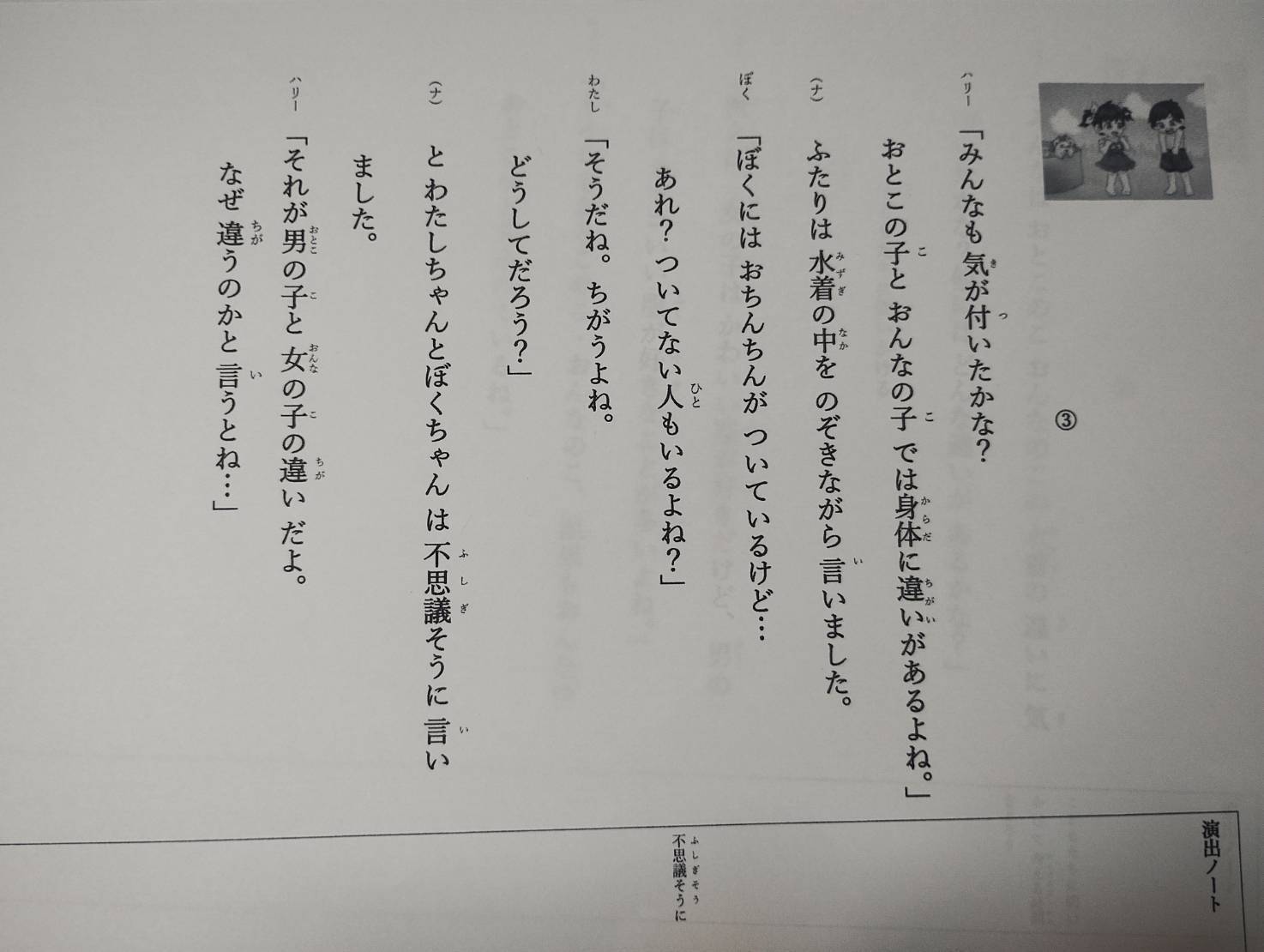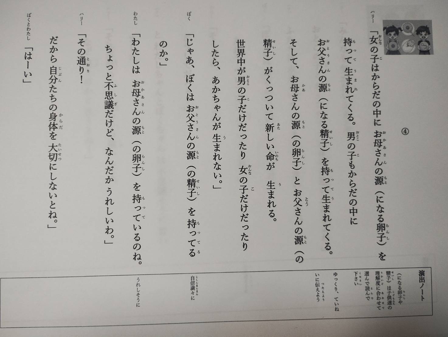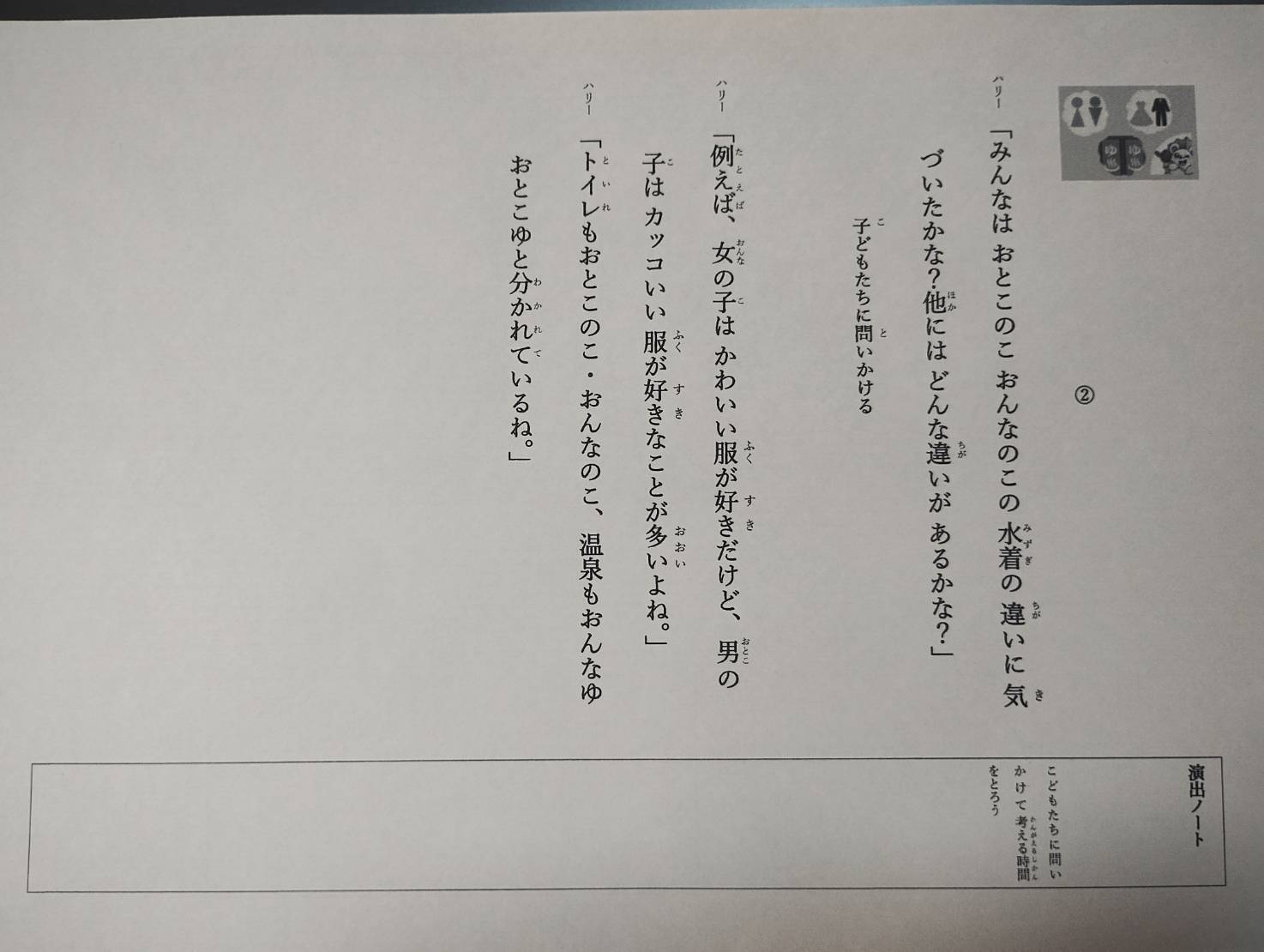 男女の違いやプライベートゾーンについて説明。よくある「おしり」「おっぱい」の言葉の使い方、「スカートめくり」「カンチョウ」遊びの注意など、幼稚園などで、問題になっていることを例題として、とりあげ、ハリー博士と考えてもらいます。