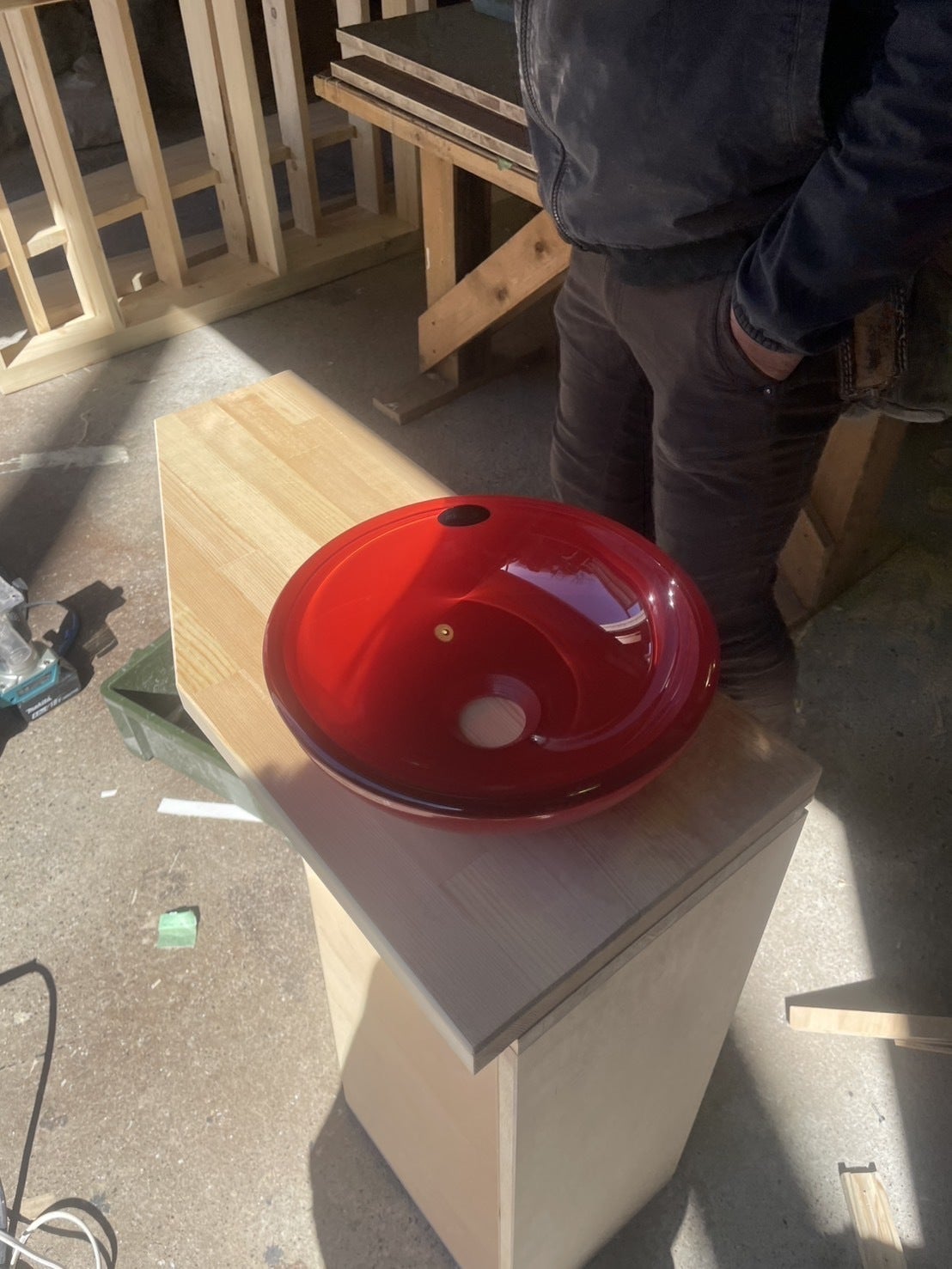 ちなみに送料込みで50万しました。はい。トイレの手洗いはこんな感じの可愛い赤色。